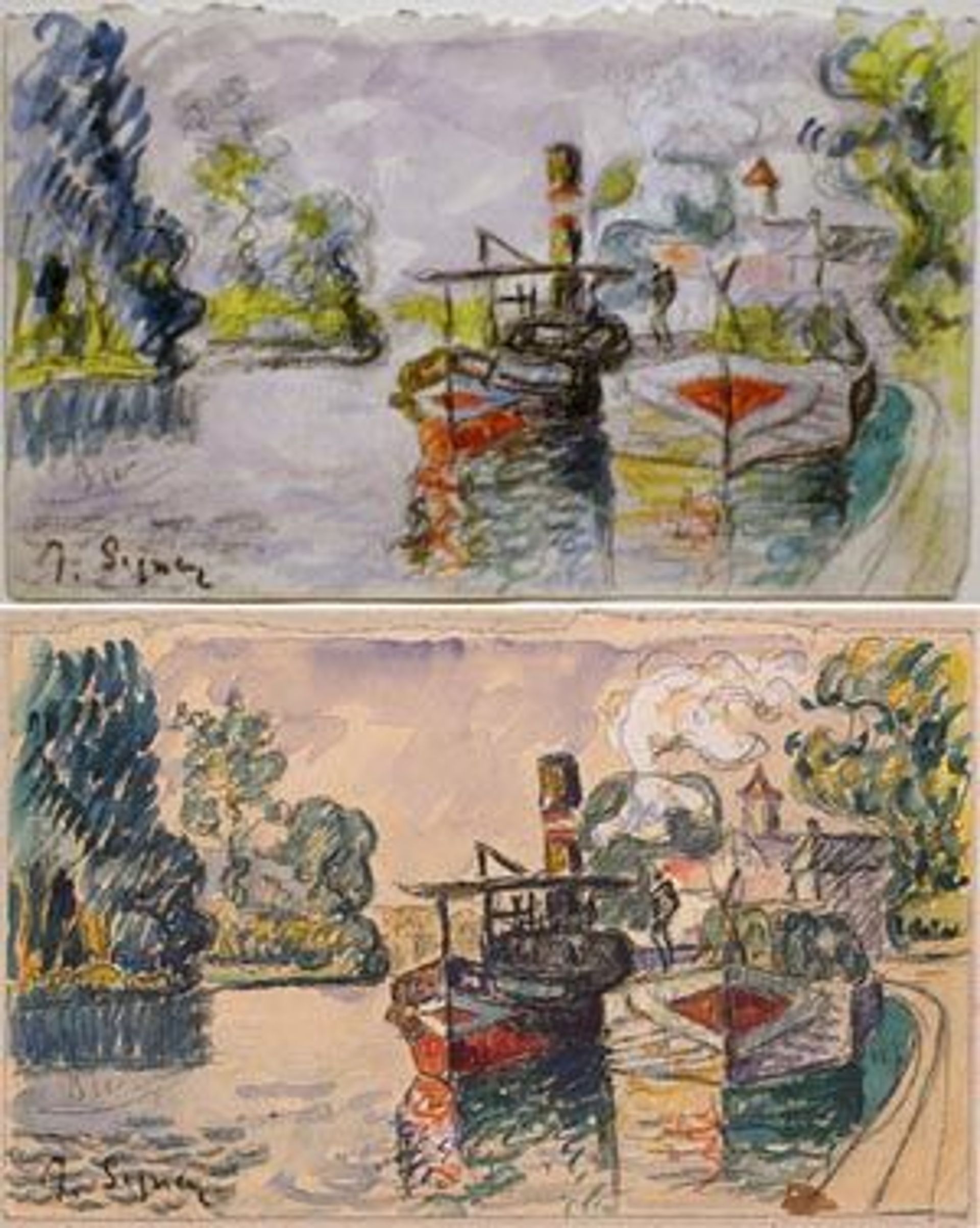 The fake copy (below) of a watercolour boating scene by Paul Signac that was offered to the Memphis Brooks Museum of Art