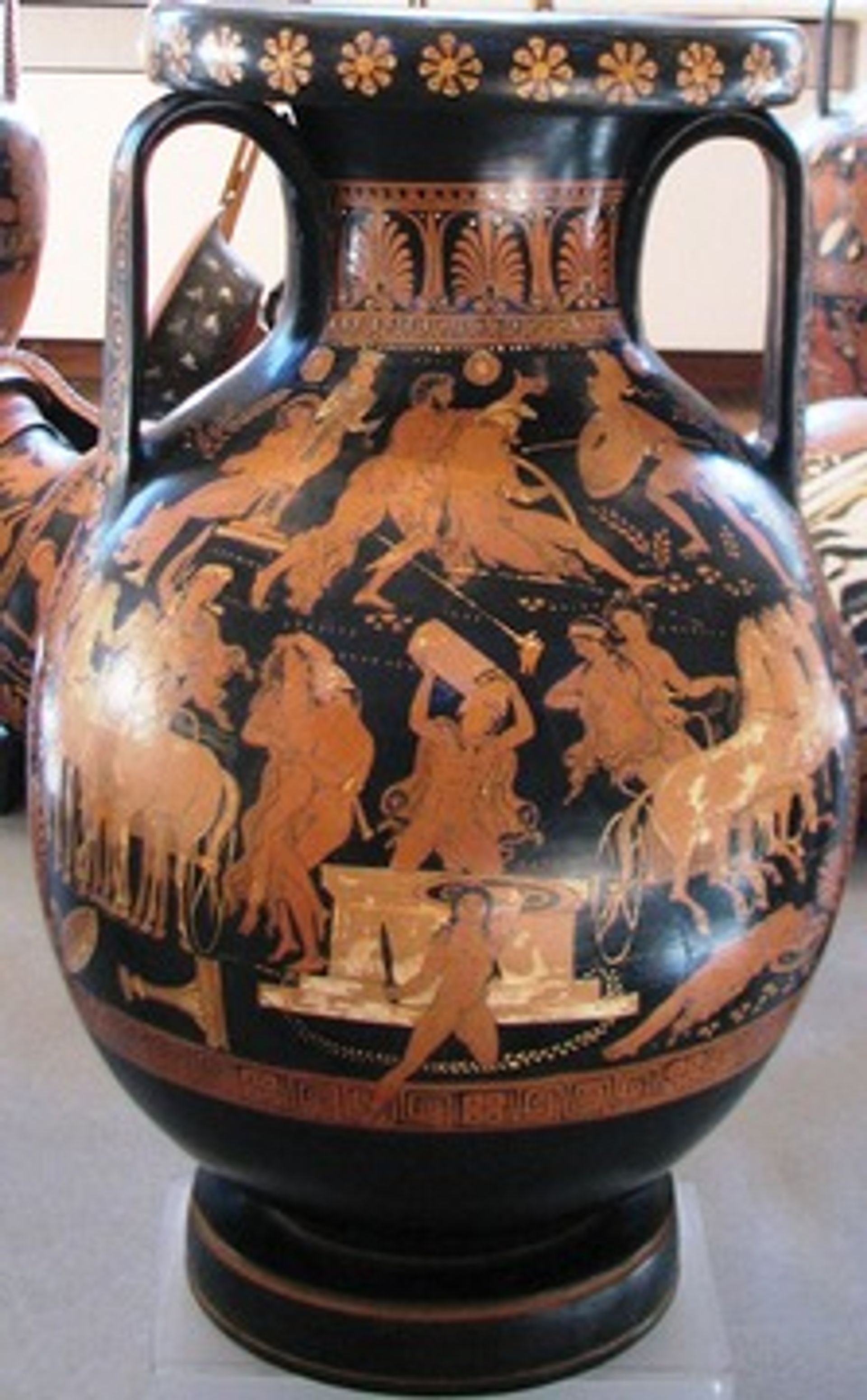 Red-figure pottery was invented in Athens in around 530BC and gradually replaced the black-figure style. It is the inverse of the earlier technique, as the figures are left unpainted in the reddish colour of the original clay. Painting the details in black, rather than incising them, allowed for finer details and more naturalistic representations of the human figure. This elaborate mythological scene features frontal poses and three-quarter views, as well as overlapping figures. The leg of the figure with the dagger dramatically overlays the decorative pattern at the foot.