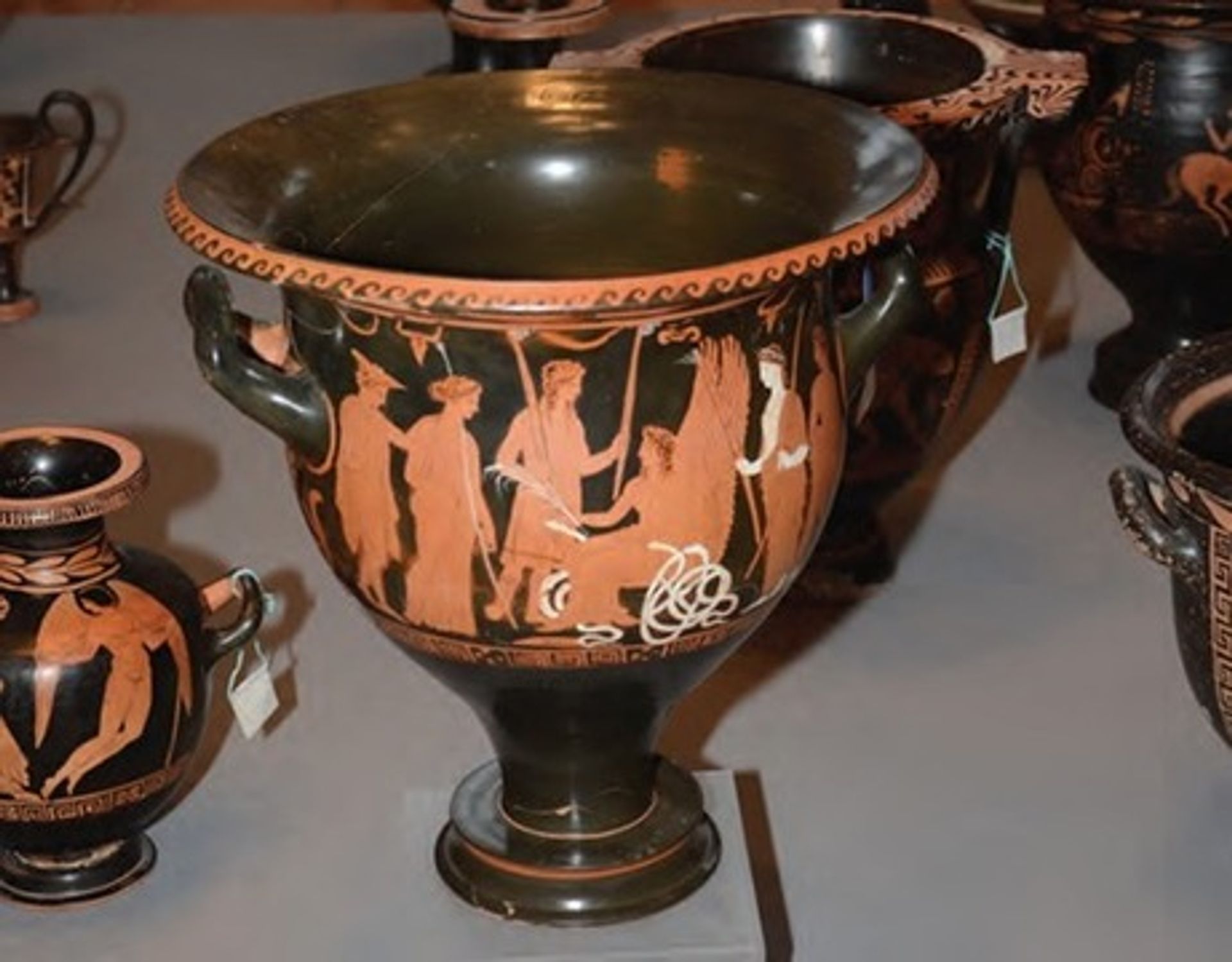 The bell krater, shaped like an inverted bell with upturned handles in the upper half of the body, is more common than the calyx. The latest of the four types of krater, it first appeared in the early fifth century and only in red-figure. This mythological scene features serpents and one of the female figures picked out in white, which would have been added after firing. While damage can be seen at the base and on the left-hand side, there does not seem to be any overpainting.