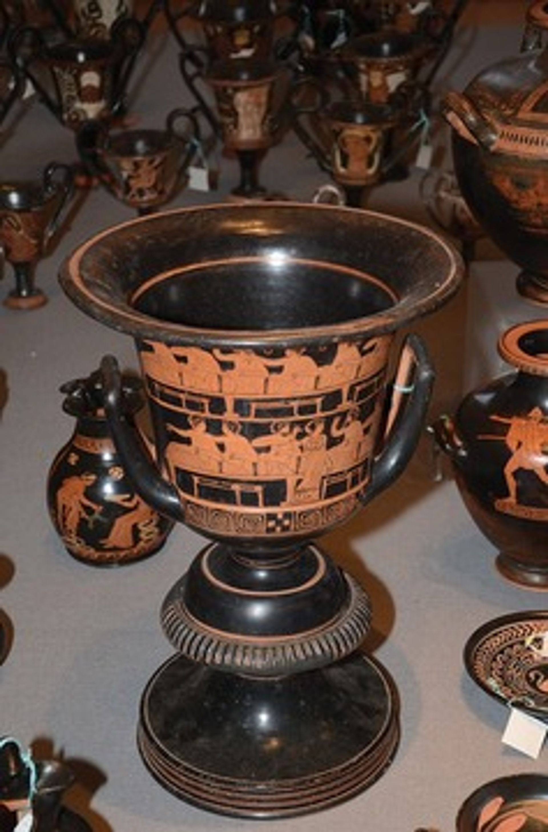 Kraters were large vessels used for mixing water and wine at banquets and could also serve as funerary urns or grave markers. The calyx form, with low handles that curl upwards like the calyx of a flower, is rarer than others. The earliest known example was produced in the sixth century by the Athenian potter and vase painter Exekias. If this red-figure krater were signed and could be attributed to a painter, it would increase its value. The decoration seems to relate to the vessel’s function: a group of bare-chested male banqueters recline with a standing woman—perhaps a servant or an entertainer. It is not known if the stand belongs to the krater.