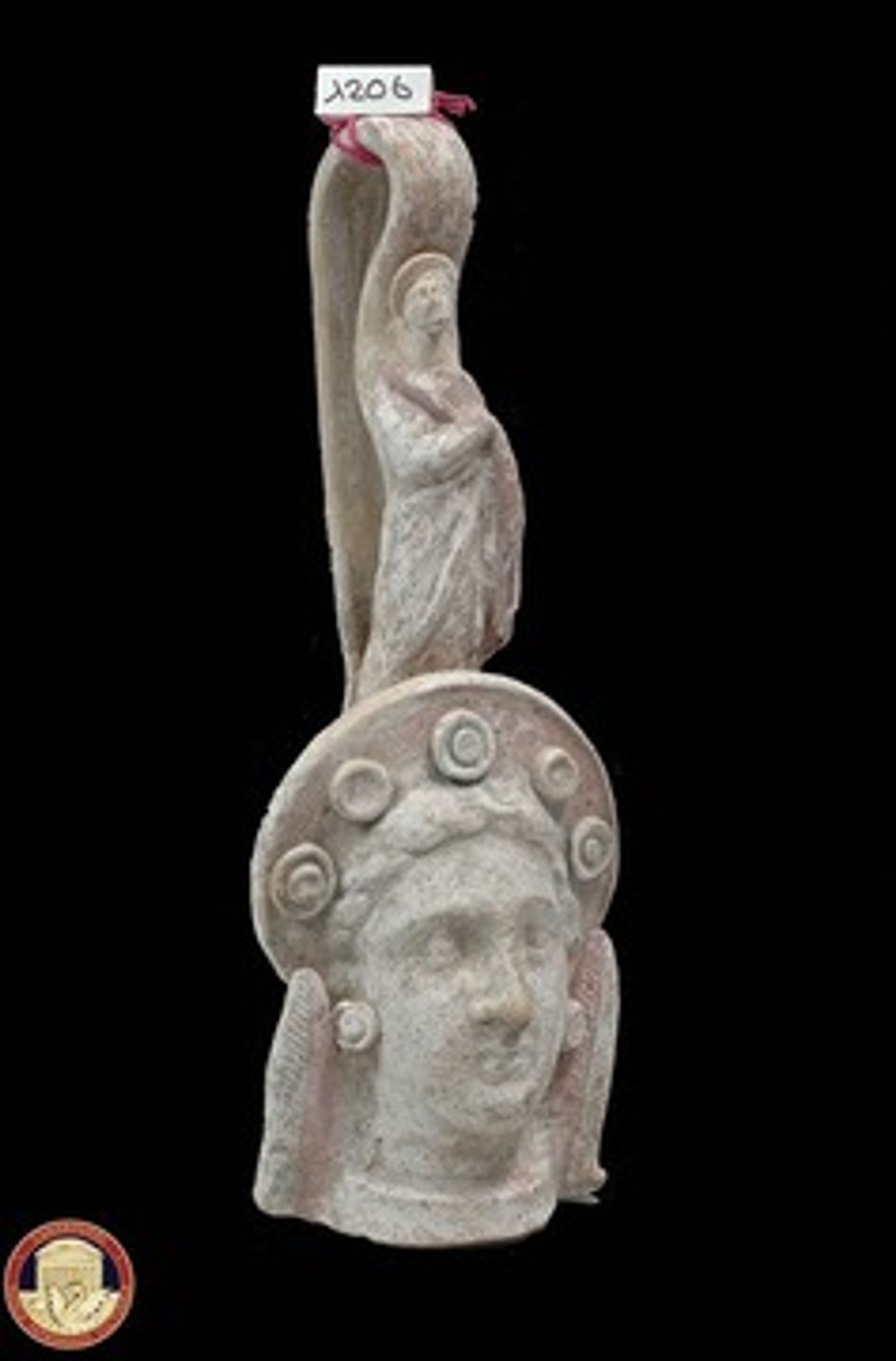 This ornament in the shape of a female head with leaves on either side of her neck, and surmounted by a robed female figurine, could be described as a pseudo vessel since it seems to be solid. Similar examples have an aperture behind the handle. Pottery from Canosa in Apulia, produced in the fourth and third centuries BC, was painted in pastel colours over a white slip rather than glazed. Usually, as in this case, only the traces of the pigments remain.