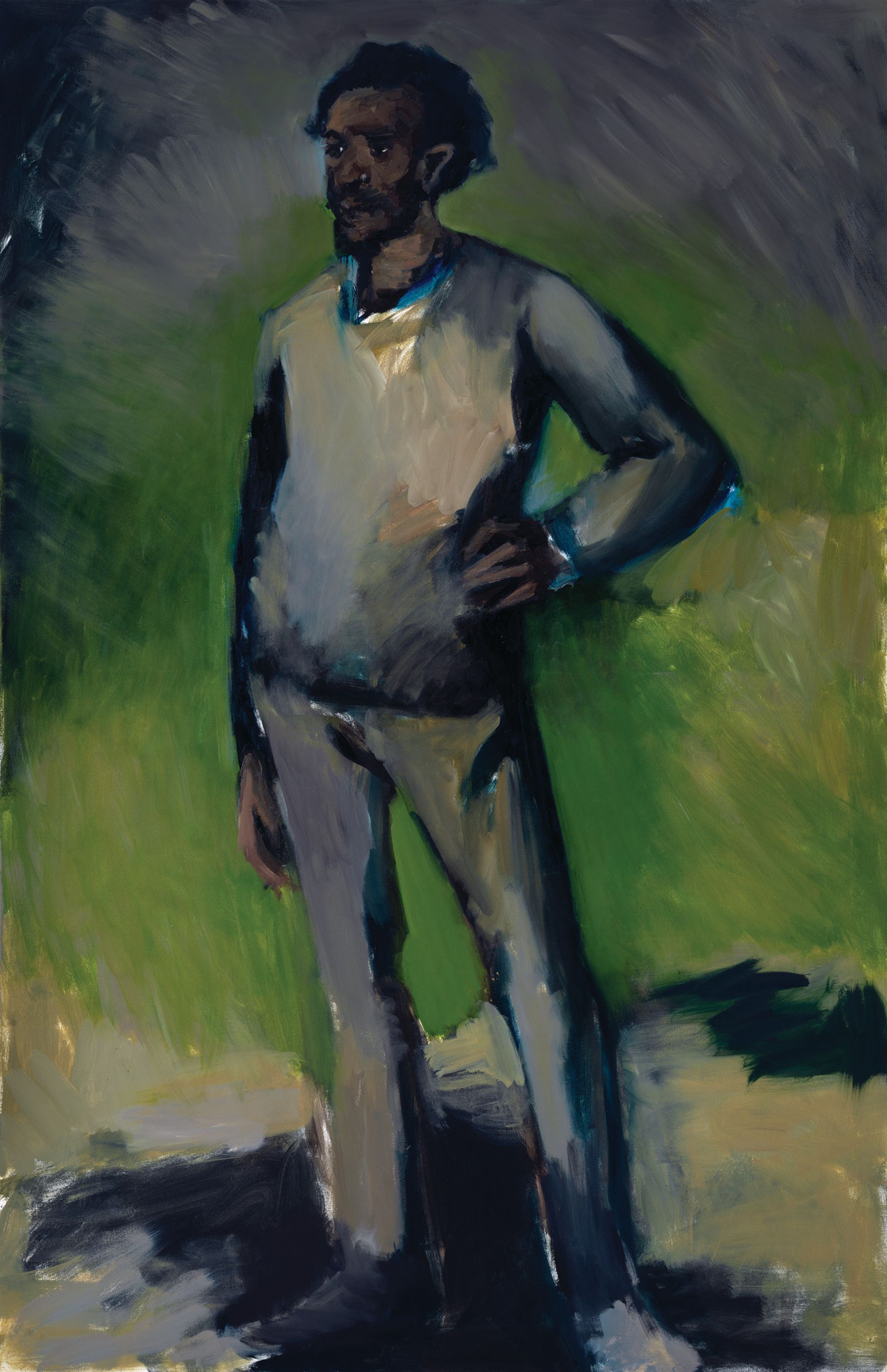 This large-scale and somewhat sinister man, wearing a loose white shirt and leering smile, has been a regular presence in Yiadom-Boakye’s work for the past few years, and often ushers in a new series of paintings. He tends to be painted (but not necessarily exhibited) in pairs, and is one of a wider cast of recognisable characters who recur in the artist’s paintings, wearing the same clothes but with subtle shifts in pose and expression. “When I start a body of work, I will do these two paintings, and each time there will be a slight variation, but essentially it’s the same man,” she says. “They are an anchoring of how I think generally and a reminder of where I am. It is also the sense of getting to know someone better. They have changed a lot since their first incarnations.”