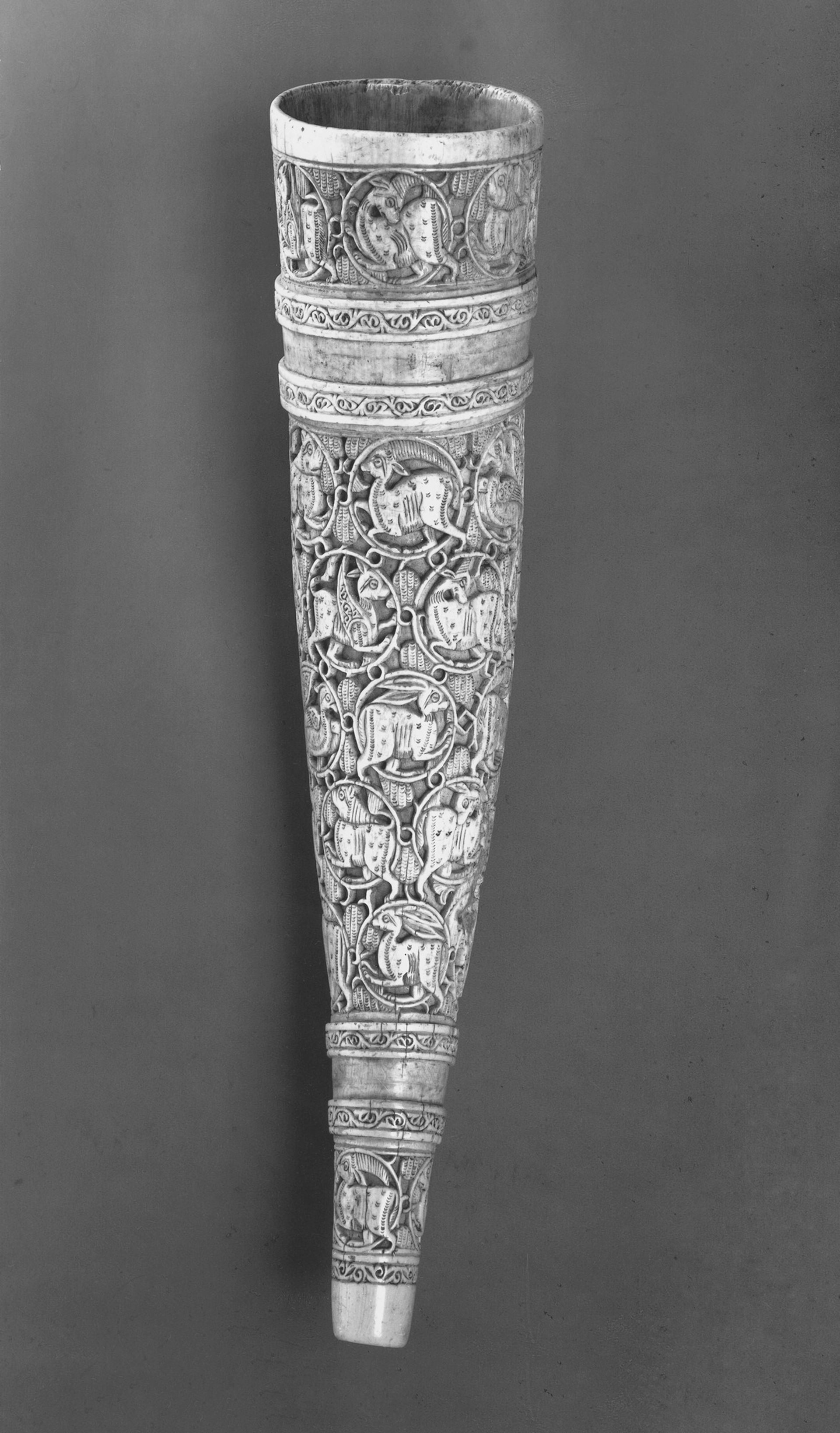 Shalem’s categories are perhaps unnecessarily complex. He assigns a group of 13 11th-century horns in the Fatimid style to possible origins in Egypt, southern Italy or Sicily. Five more are considered as definitely from Egypt. More than 20 pieces from the same period are then placed in a different class described as “archaicising” or in the antique style. We have another section for “hybrids” from southern Italy or Sicily, and some related pieces in “high Medieval” style, then a small number of central European and Nordic origin, and, finally a group without carved or incised décor. Appendices include two Coptic fragments, some Scandinavian walrus ivory and six horns of 16th-century or late Medieval date.