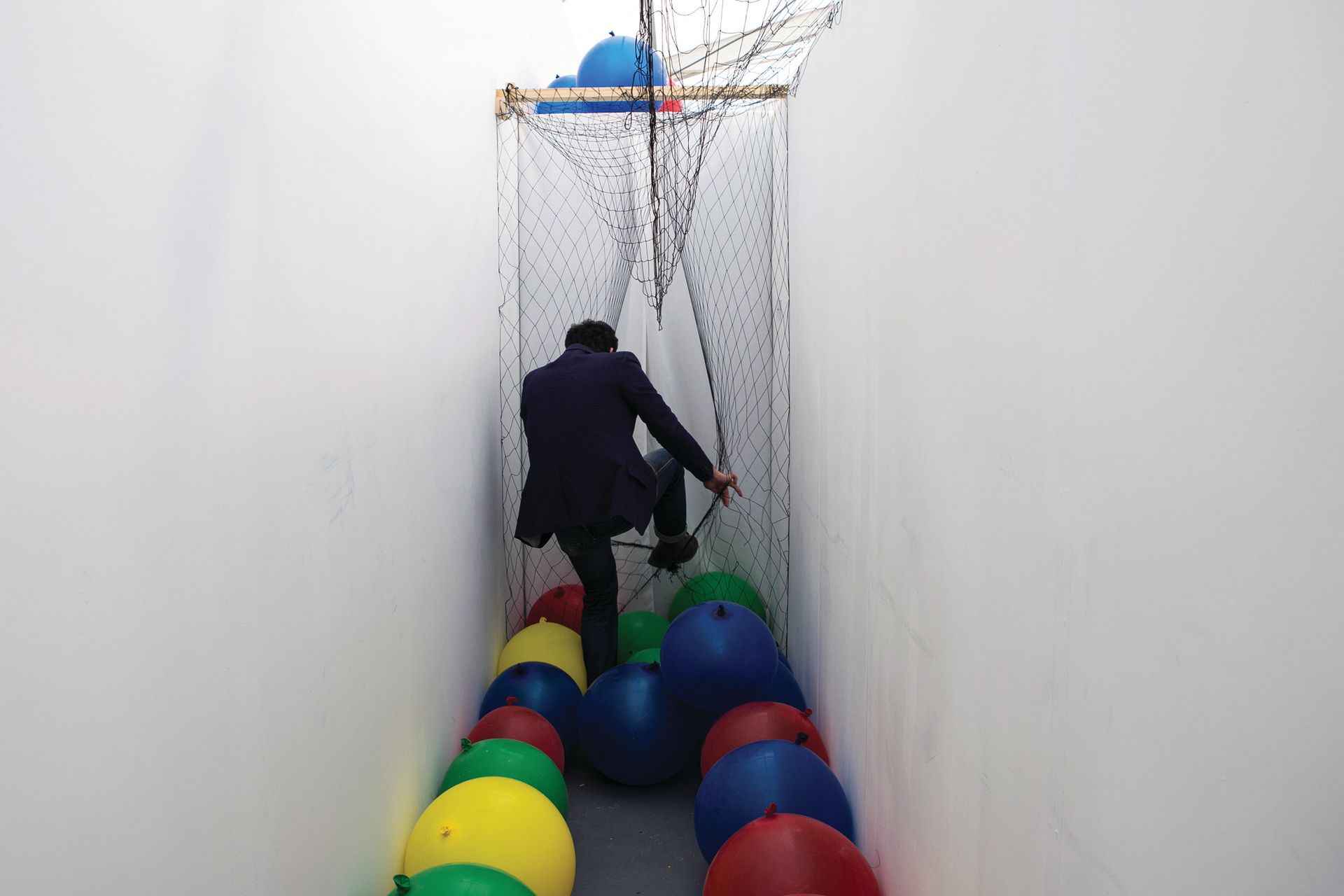 In New York, where Frieze staff gave verbal warnings and had visitors sign waivers, the labyrinth had emergency exits—anathema to Maciunas. But times have changed, along with health-and-safety regulations. Additionally, Frieze has labour contracts and when Alemani told Miller that her team would do the construction, he balked. Already sceptical of placing a Fluxus work in an art fair, he felt strongly that any restaging would be inauthentic without him. However, other commitments meant postponing for a year.