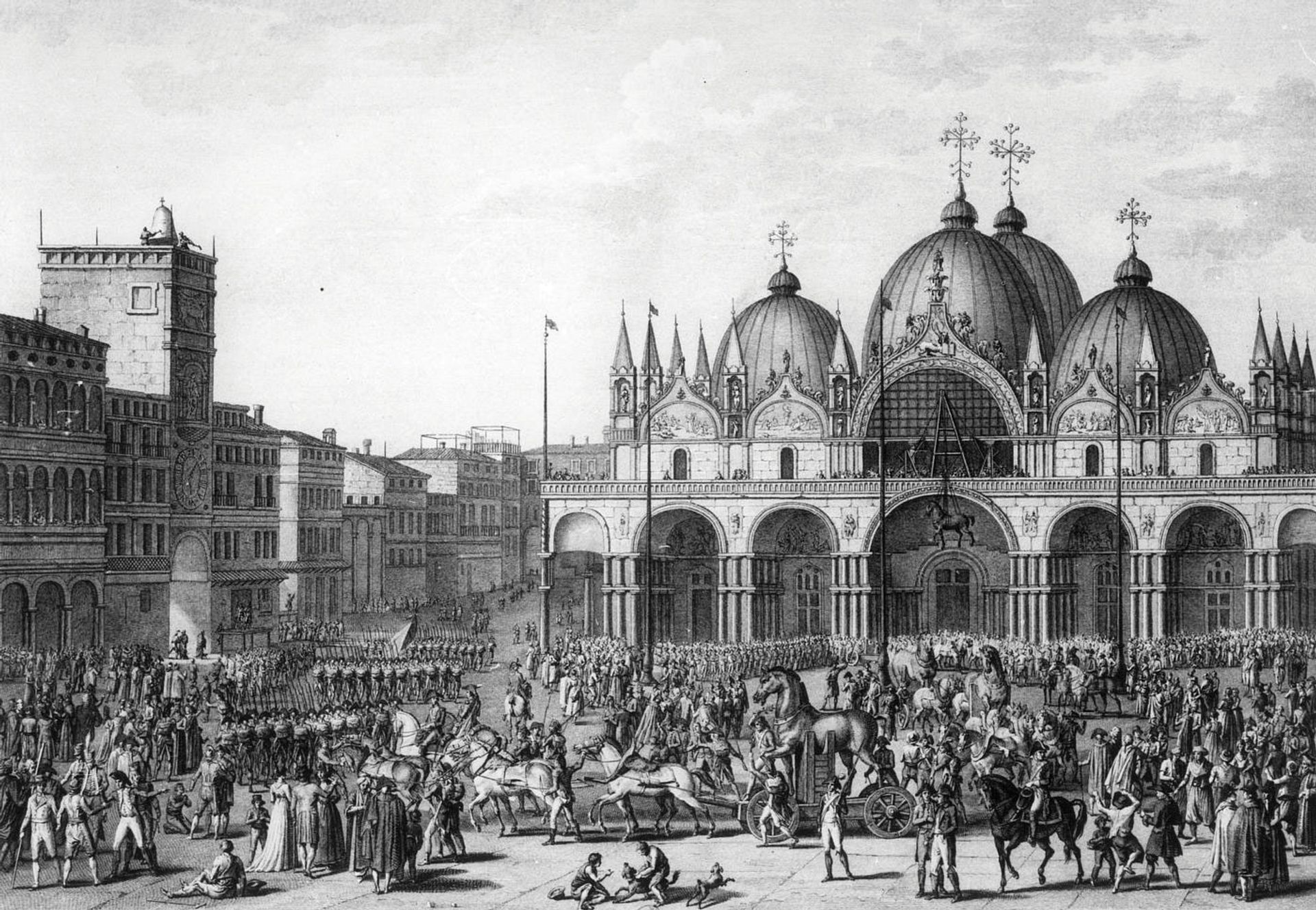 Jean Duplessi-Bertaux's 1797 engraving showing the removal of the historic bronze horses from St Mark's Basilica in Venice for transportation to Paris. When the bronze horses were taken down from the Carousel in Paris in September 1815, before being returned to Venice, the streets were lined by Austrian dragoons, part of a show of force by Allied occupying forces, with the Duke of Wellington to the fore. They arrived back in Venice in December 1815