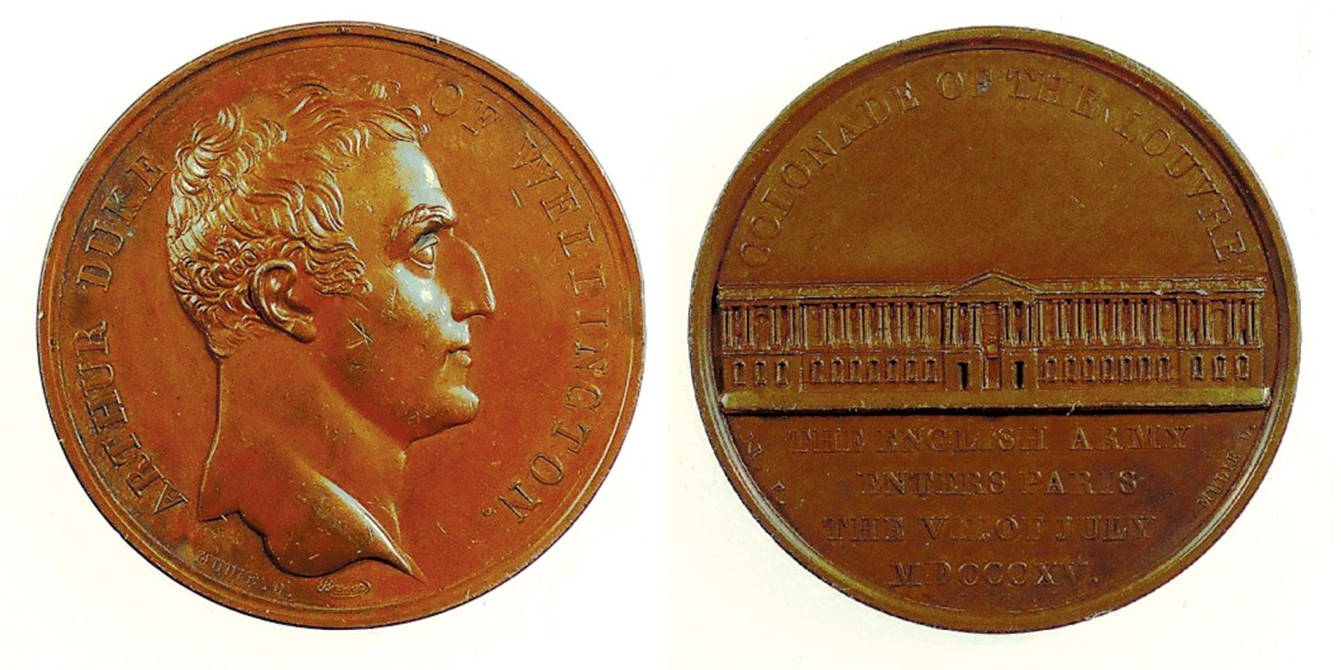 A medal commemorating the Duke of Wellington and the British army’s entry into Paris on 7 July 1815, one in a series of national medals commissioned by James Mudie in 1820, shows the duke’s head in classical profile on the obverse, and the Colonnade of the Louvre on the reverse