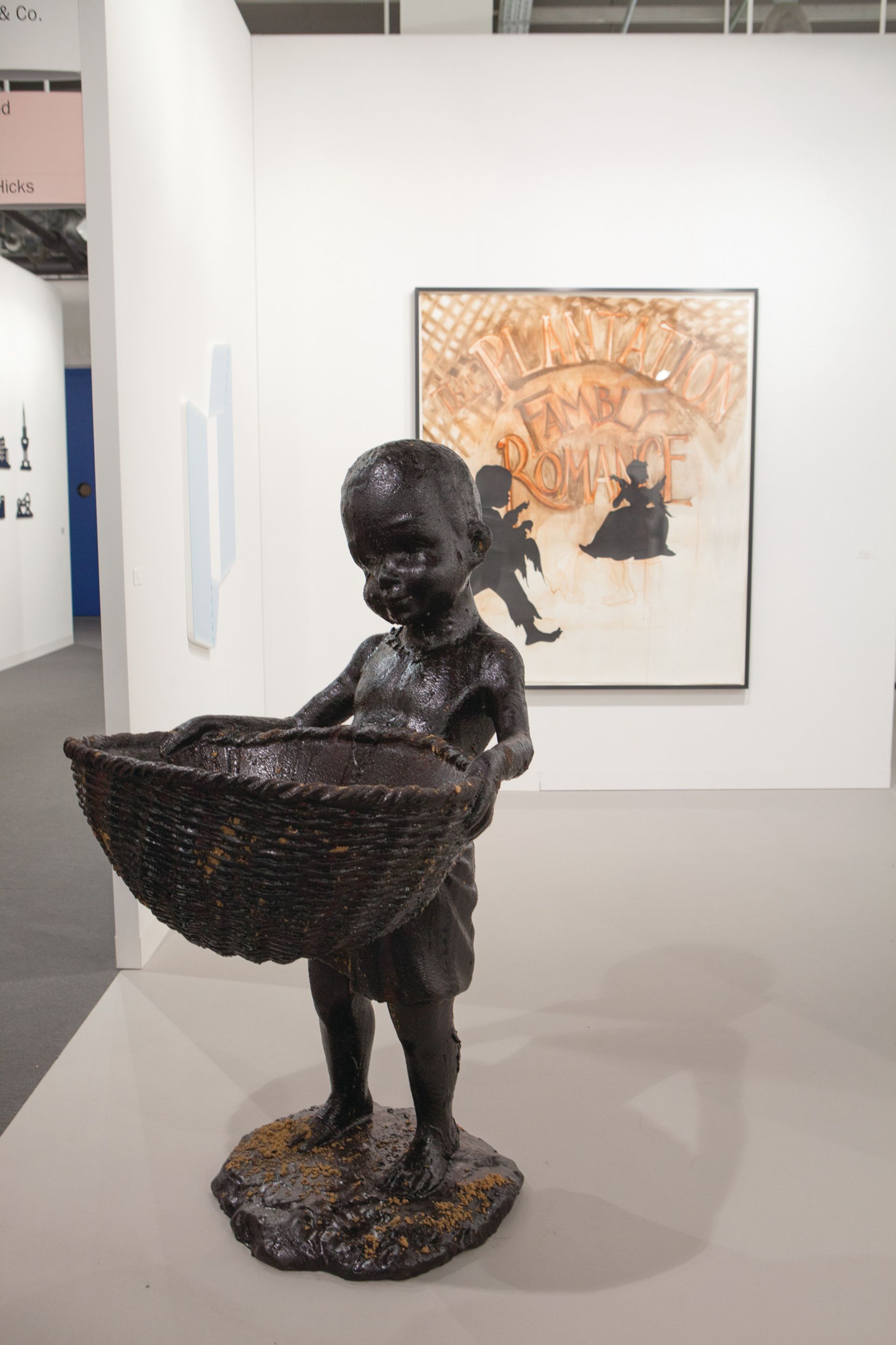 Such socially engaged works are not traditionally big sellers, and so dealers rarely bring them to fairs, but visitors to Art Basel this week have seen more works dealing with racial politics than ever before, by artists such as Glenn Ligon at Luhring Augustine (A2), Carrie Mae Weems at Jack Shainman Gallery (T6), Tony Lewis at Massimo De Carlo (R3) and in Unlimited (U6), Melvin Edwards at Stephen Friedman (L11), David Hammons at Salon 94 (J9), Lorna Simpson (also showing in Unlimited, U23) and Mickalene Thomas at Galerie Nathalie Obadia (K17), Kara Walker at Sikemma Jenkins (R11) and Victoria Miro (R7), and Adam Pendleton at Pace Gallery (A6).