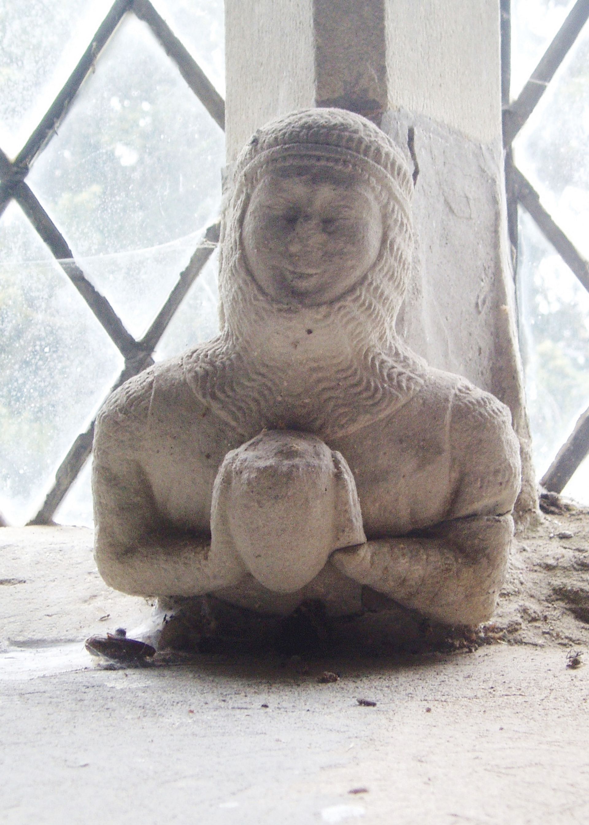 • A stone funerary head of a knight from St Michael’s Church in Castle Frome, Herefordshire. It probably came from a memorial to Adam de Lacy, who died in 1297.