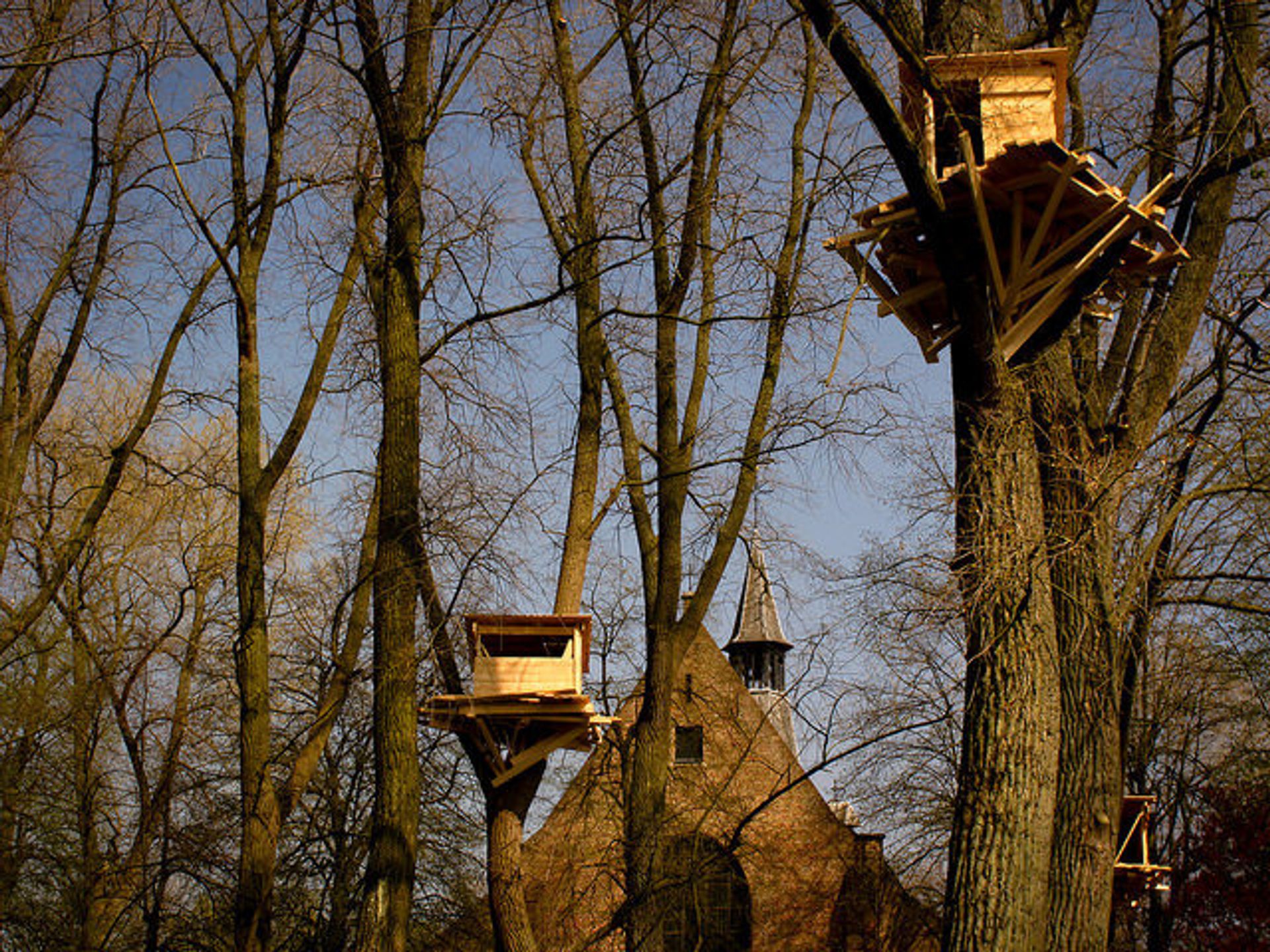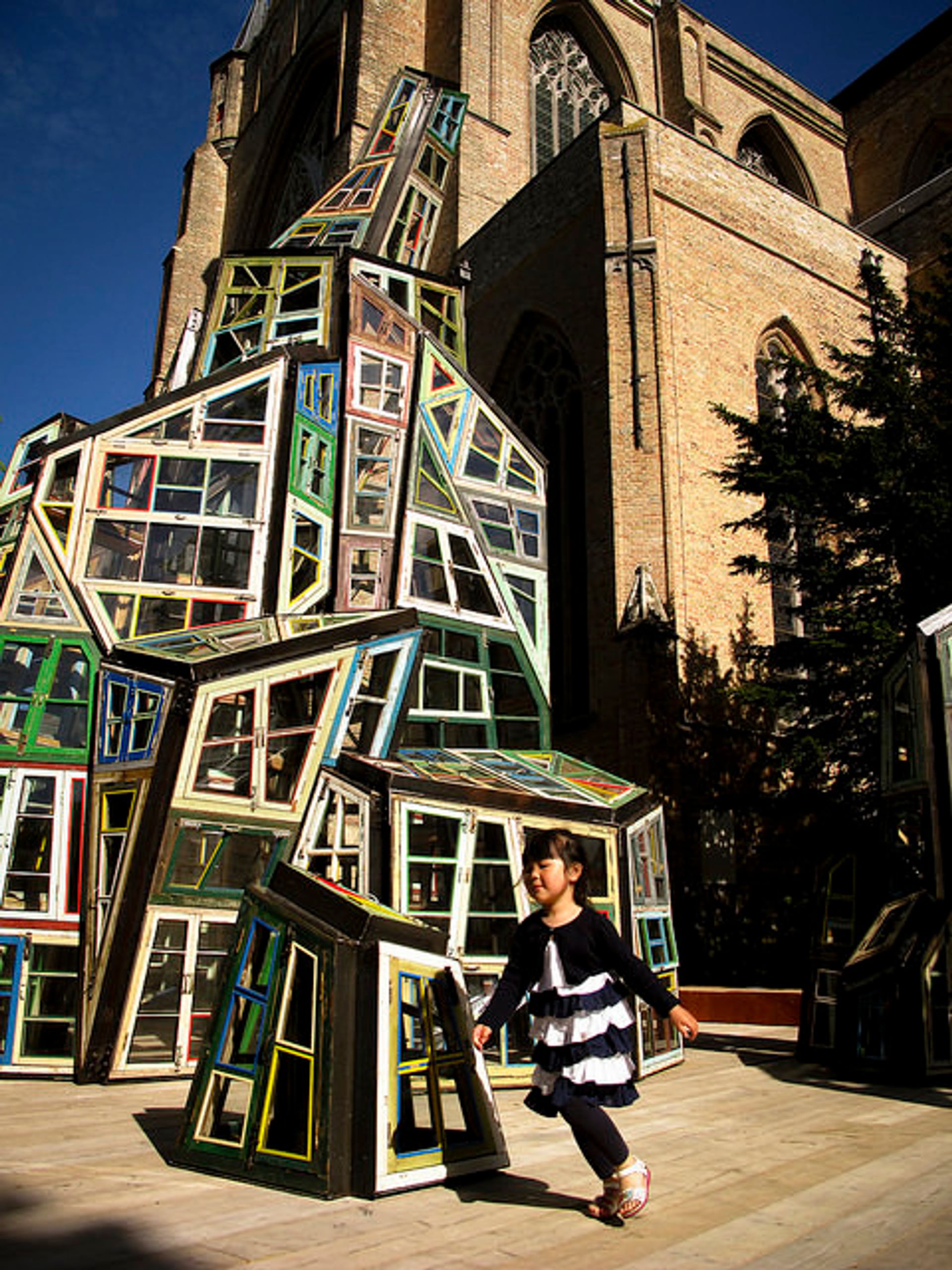 Perhaps it would look more like China, the Beijing-based artist Song Dong posits. Standing before the immutable grandiosity of the 10th-century St. Salvator’s Cathedral, Song built a kind of counter-monument to transience: a “cathedral” patched together entirely out of windows from demolished Chinese buildings (Wu Wei Er Wei [Doing Nothing Doing], 2015). Or perhaps populations would rise into the trees and live in child-sized huts like those that the Japanese artist Tadashi Kawamata perched throughout a poplar grove (Tree Huts in Bruges, 2015).