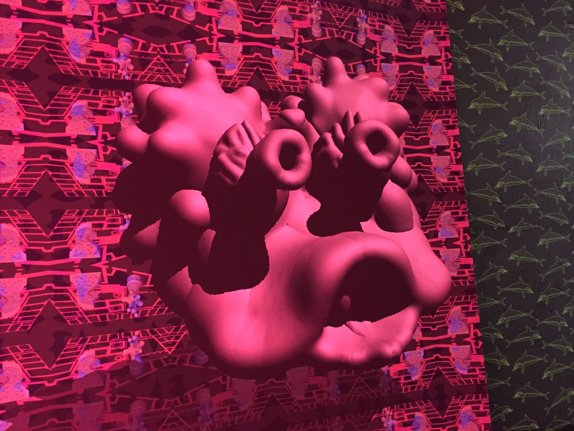 There was brisk business for gins and tonics at the Capsid Club, based on the form of the protein shell—or capsid—of the HIV virus, with further computer-generated virus “heads” appearing throughout the labyrinthine installation, whether in paintings, 3D prints and even as a giant puce inflatable pug virus. There were more queues for special tarot readings with cards featuring images ranging from EastEnders heroine Dot Cotton to the Chrysler and Empire State buildings tucked up as The Lovers. (However, there was a distinct lack of takers among the party crowd for the rapid HIV testing on offer in a blue-painted replica of a garden shed played in by the artist as a child.)