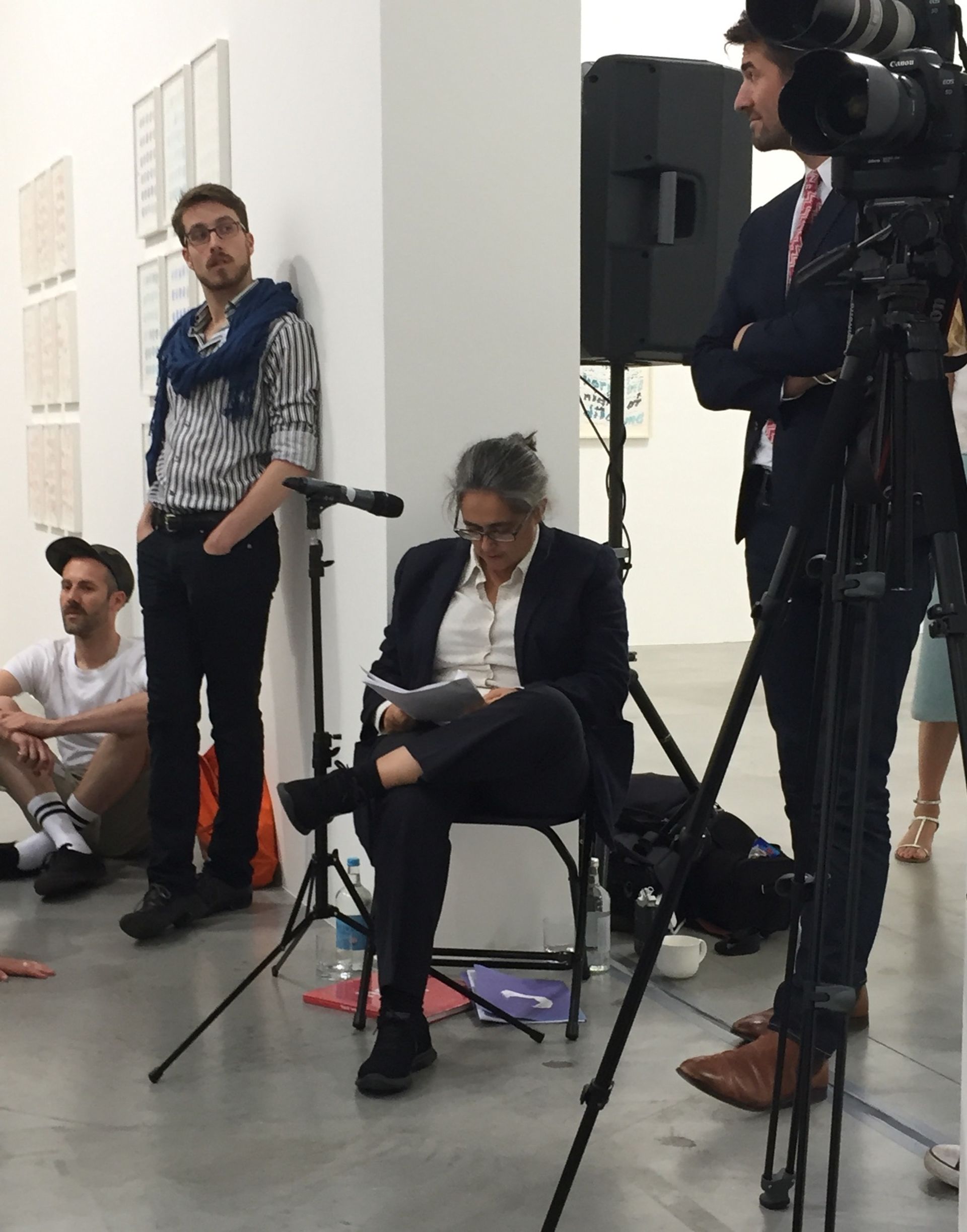 There were some furious hushes and tutting at the sound of noisy chattering emanating from the back of the gallery as poet Anne Carson and actor Simon McBurney began their joint reading of Carson’s new poem Hack Gloss. The text had been written in response to Roni Horn’s drawings and marked the finissage of her show at Hauser & Wirth on Saville Row, London, last Saturday (25 July).