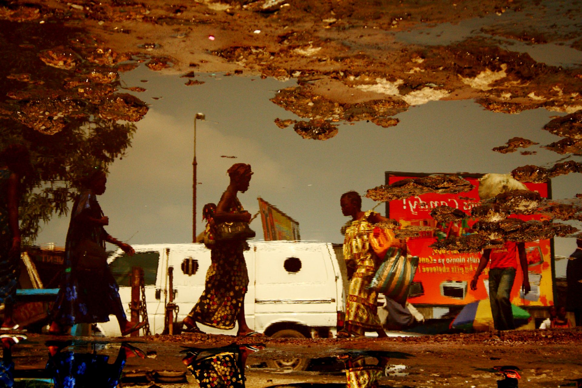 Katembo’s final, untitled series is a continuation of two earlier projects. The first, Un Regard (2009), is a series of photographs depicting Kinshasa citizens as seen in the reflections of puddles. In an interview with the Guardian shortly before he died, Katembo described how people in the Democratic Republic of Congo (DRC) do not usually like having their photographs taken.