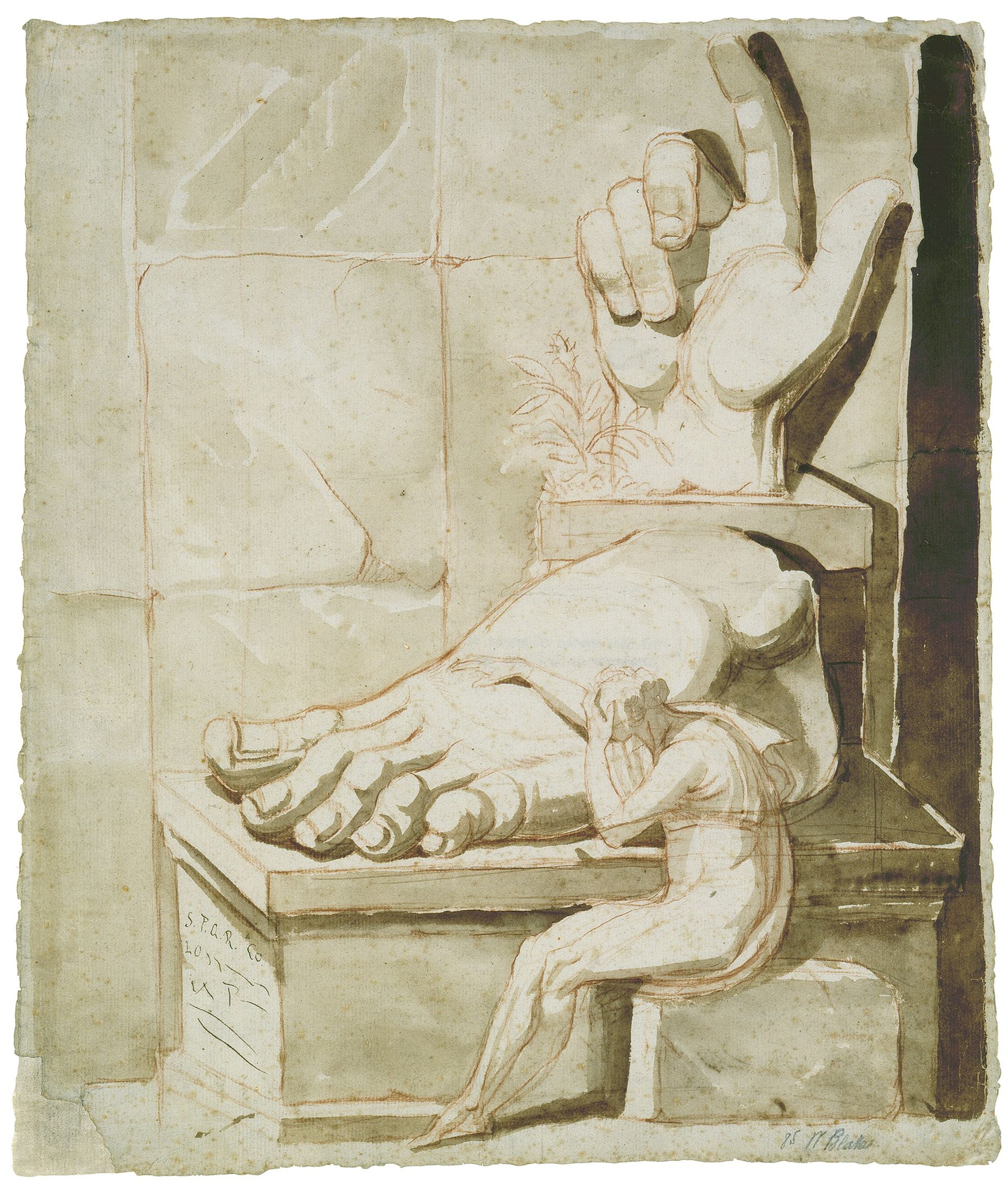 For those seeing the exhibition at the Soane Museum in expanded form and spread across two galleries, there are welcome additions to the display from American, British and European collections. An impressive pen and ink drawing from the Getty Museum by Federico Zuccaro of his brother Taddeo at work in the Belevedere Court in the Vatican is the centrepiece of the first room. One in a series of 20 drawings made by Federico of Taddeo that charts his brother’s struggles as a young artist, this work also epitomises the exhibition’s central premise of how artists over the centuries were drawn to the antique as the bedrock of their artistic education. Other magnificent exhibits featured at the Soane include Charles Joseph Natoire’s meticulous watercolour of the life class at the Academie royal de peinture et de sculpture in Paris, bequeathed by Sir Robert Witt to the Courtauld Institute of Art, and one of the highlights of its drawings collection. Finally, one drawing that must be mentioned is Henry Fuseli’s extraordinary proto-romantic image, The Artist Moved by the Grandeur of Antique Fragments; the Right Hand and Left Foot of the Colossus of Constantine (c.1778-79), a composition which signals a sea change in artistic response to the antique, where admiration is tempered by despair and a sense of loss.