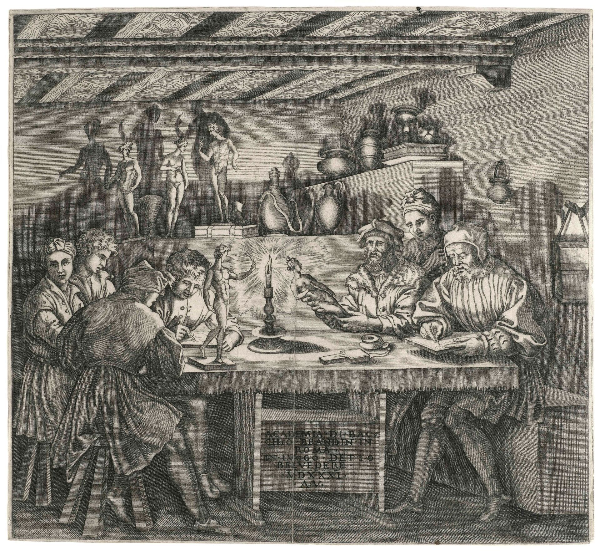 The show is now at the Soane Museum—it was first at the Teylers—and although many of the exhibits are included in both venues, some are exclusive to one museum. Thus at the Teylers, the print by Cornelis Cort after Jan van der Straet’s The Practice of the Visual Arts (1578) from the Rijksmuseum, Amsterdam, was displayed, while the Soane has van der Straet’s original drawing from the collection of the British Museum; the selection dictated presumably by curatorial logistics. Similarly, Golzius’s chalk drawing of the Apollo Belvedere (1591) was displayed only at the Teylers while the engraving made from it—with the addition of the figure of a draughtsman at its feet—is shown only at the Soane. At the Teylers Museum the exhibition included a painting by the local artist Wybrand Hendriks of the Haarlem Drawing College of 1799, depicting its members grouped in conversation before an assembly of casts upon a mantelpiece and, hidden away in a corner of the room, the only female presence: a cast of the Venus de Medici.