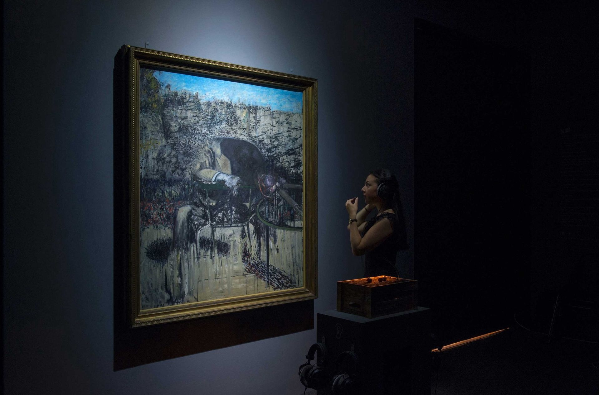 On entering the gallery, you listen briefly to an introductory spiel from a disembodied female voice projecting through a loudspeaker (I later learn that the voice belongs to the British actress Tamsin Greig). You are given a device to wear on your wrist—a sort of basic Apple Watch but without the ability to tweet. The device measures your pulse and sweat during the experience, in order to ascertain which paintings and accompanying sensory stimuli you react to the most. (On completion of my visit, the data doesn’t download, so I do not get my results.)