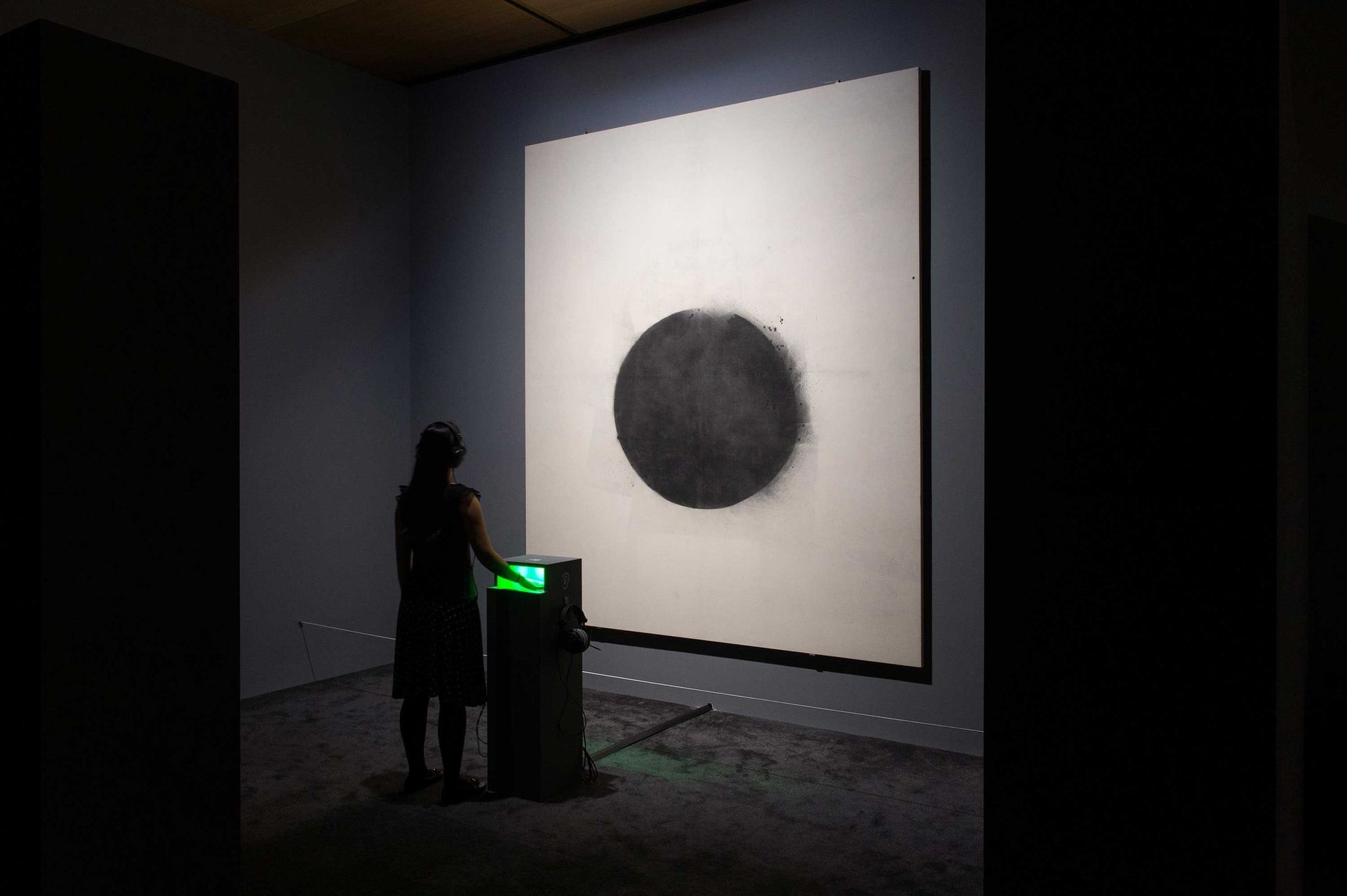 I don’t recognise the painting at first, as we take our place in front of a big black circle. We put on headphones and then take turns placing our hands into a box that blows bursts of air that occasionally synch with the sounds coming from the headphones. Percussive poundings and gong crashes are interspersed with imitation rain and explosive clatters that mimic the circular paint spatter of John Latham’s Full Stop (1961). The tactile element, which I later learn is not a burst of blown air but “focused ultrasound”, must be influenced by the method Latham used to create the painting: a spray gun. It reminds me of Latham’s series of One Second Paintings from the 1970s. With those works, Latham developed a theory of “Flat Time.” Rather than thinking of all that exists as objects in space, he proposed that everything was an “event” taking place in time. The One Second paintings became a manifestation of a “least event”, or the shortest possible action. A burst of the paint gun and done.