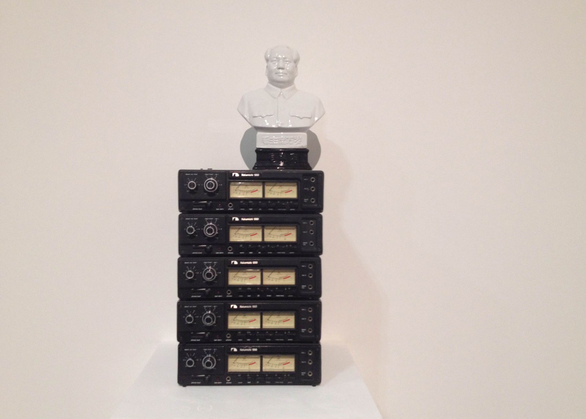 This is the optimistic worldview of our contemporary allegorists, who assume sincerely that literally any arbitrary assortment of things can tell a good story. What else could possibly account for Vo’s Guggenheim exhibition? What else explains Harrison’s sculpture Tiger Woods (2006), where a blob of cement and plastic and a can of lemonade sit on a wooden box? How else can we make sense of Adkins’s decision to put five hi-fi players atop one another with a porcelain bust of Mao Zedong at top (Darkwater Record, 2003-2008)? Why else would Bader think a box of Exodus Paste Horse Wormer would be worth exhibiting (To Have and to Hold: Object H, 2014)?