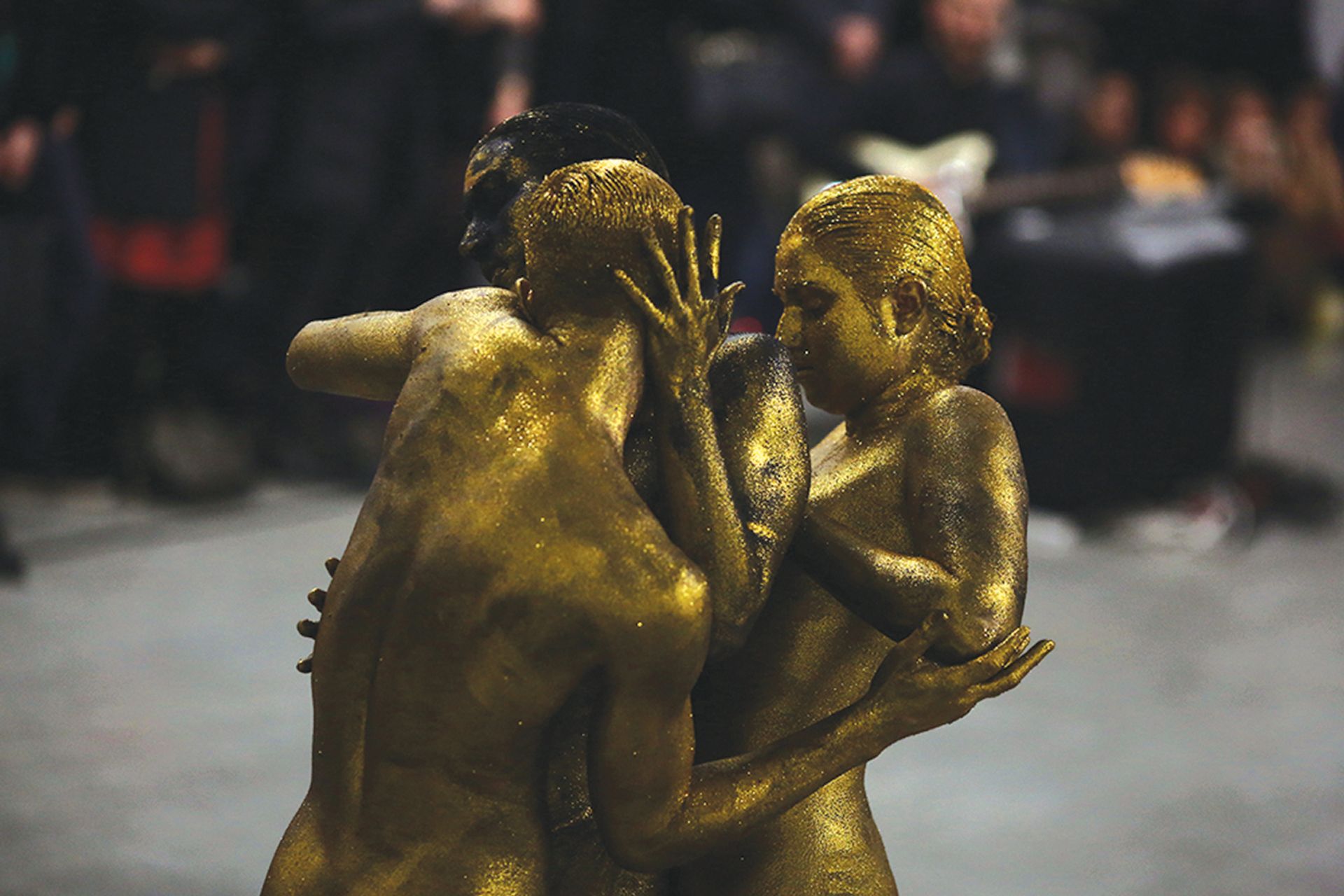 Over the past few years, Eddie Peake has been propelled to prominence by his ambitious, often sexually provocative use of live performance, dance and specially composed music, which he frequently combines with paintings, sculpture and architectural installations. Peake first attracted attention by staging a naked five-a-side football match at the Royal Academy of Arts in 2012, while studying at the RA Schools. Before graduating, he created dance performances for the Chisenhale Gallery, Tate Modern’s Tanks and Performa 13 in New York, as well as having his first major show at White Cube; he is the first young British artist to be taken up by the gallery for some time. Now, the 34-year-old, who also runs a cult club night called Anal House Meltdown with fellow artists George Henry Longly and Prem Sahib, has produced a multimedia gesamtkunstwerk for the Curve, a 90m-long gallery at the Barbican, London—his largest show yet.