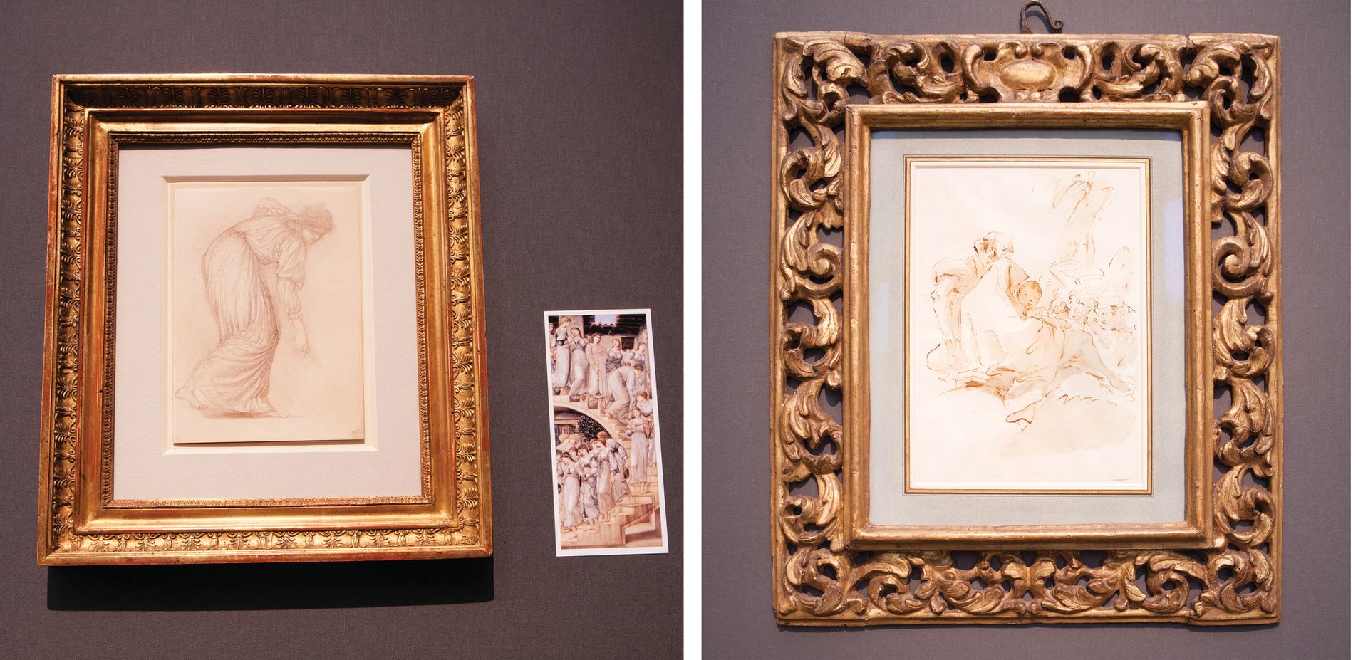 Edward Burne-Jones, Girl Descending a Stair [study for The Golden Stairs] (1872-80; pictured left). Giovanni Battista Tiepolo, The Holy Family resting on the Flight into Egypt, with two Angels kneeling and offering food (undated; pictured right)