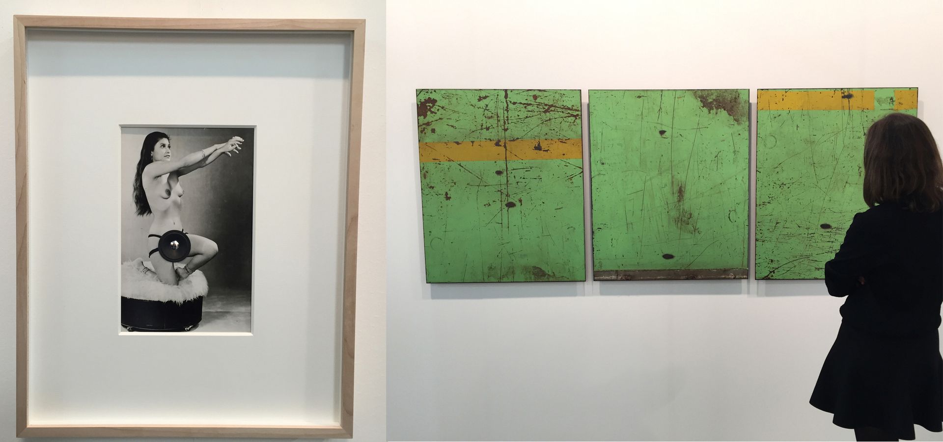 Gabriel de la Mora at Timothy Taylor Gallery This is the London gallery’s first time at the fair, “and we’ve only heard good things,” says one of their salespeople, Alexandra Leive. “It’s also quite a slow-burning fair, which is quite refreshing.” On their stand is work by the mid-career Mexican artist Gabriel de la Mora, notably a colourful metal triptych made from a repurposed floor that was salvaged from a derelict colonial house in Mexico City. The work sold for $50,000 on the opening night. Also by the same artist is a series of small, vintage photographic “intervention” pieces, such as the cheeky one in the foreground above, which are selling for $8,000 each.