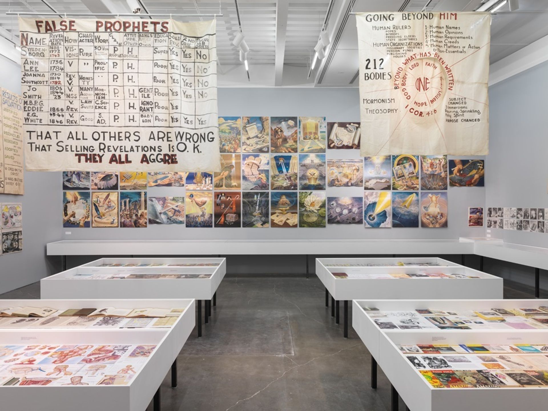 Stepping into Jim Shaw’s current exhibition at the New Museum in New York, The End is Here, one wonders just how much is on his mind, and how all this stuff could possibly fit into his studio. The show includes a tremendous amount of work, including My Mirage (1985-91), a selection of Dream Drawings (1992-99), his Thrift Store Paintings (first shown at the Metro Pictures gallery in New York in 1991), a collection of religious propaganda and ephemera titled The Hidden World which has been presented in various iterations, the enormous murals of Labyrinth: I Dreamt I was Taller than Jonathan Borofsky (2009) and even early works from Shaw’s graduate school work at CalArts. In trying to navigate it all, it becomes clear that the show presented a curatorial challenge: the question was not only how much to include, but also what connections could be drawn between the various works of an artist obsessed with mythology, personal psyche, narrative and counter-culture. The exhibition feels like an attempt at spectacle, but it is beautiful also in its more subtle moments. Its size means it could easily take half a day to go through.