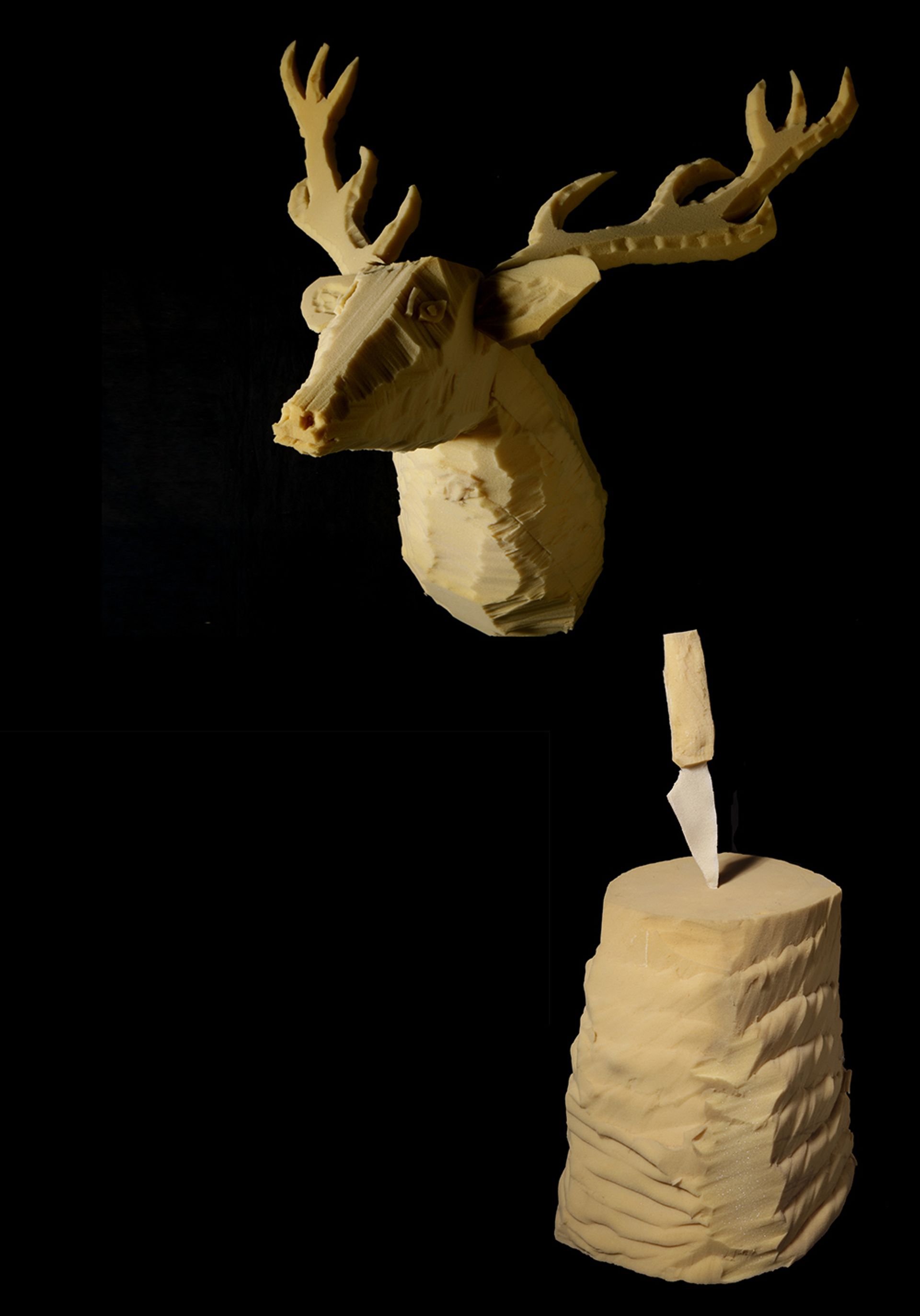 Dina Shenhav: D.O.A, until 31 January 2016, ArtCenter [Little River Edition] The normally stark space of a hunter’s cabin turns soft and squidgy for Dina Shenhav’s installation D.O.A (Dead on Arrival). The Israel-based artist is known for her use of soft materials such as foam and ash, which stand in direct contrast to her tough subject matter, including conflict and destruction. For this immersive work, Shenhav has carved items that would normally be found in a hideout deep in the woods—including the hunter’s boots and leftover dinner to an arsenal of weapons and hunting prizes—from yellow mattress foam. The bizarre result is a theatrical feeling of “soft” horror where the domestic domain meets the sport of killing. A.D.