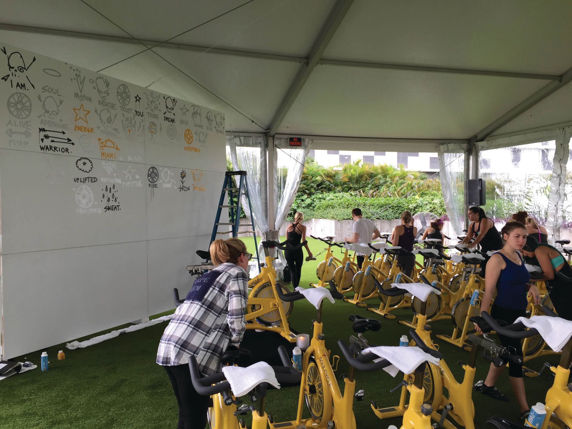 Turn, baby, turn “I know it’s early,” the instructor Soeuraya Wilson cooed over her headset as the sun rose on her 7.45am class on Monday at Soul Basel Miami Beach’s SoulCycle pop-up (until 4 December). “But this is Art Basel, so you’re gonna have to get loose.” The class, which convened behind the 1 Hotel South Beach, was promoting the under-construction fitness studio in the boutique resort. There was nothing overwhelmingly artistic about the event, besides perhaps the relational aesthetics in the contrast between the largely female, middle-aged crowd and the rough edge of the music blasted by the live DJ duo ASTR, who played tracks such as Juicy Jay’s Low (sample lyric: “Faded at the fashion show, tryna grab a bitch off the runway/I ain’t even pack no clothes, nothin’ but rubbers in my suitcase”). That and the fact that the artist Gregory Siff worked on a mural for the new studio, accompanied by words such as “tribe”, “sweat” and “everything” — feeding, he said, on the energy expended by those in the class. “It’s a stimulant,” the artist said. “And I’m like Andy Warhol up there, jumping down from the ladder, taking Polaroids in the crowd.” (Siff did this during the class, with a paint-stained camera.) Most of the sweaty cyclists did not smile for him. Afterwards, they drank cold-pressed juice and iced coffee, and were awarded T-shirts that read SOUL BASEL.