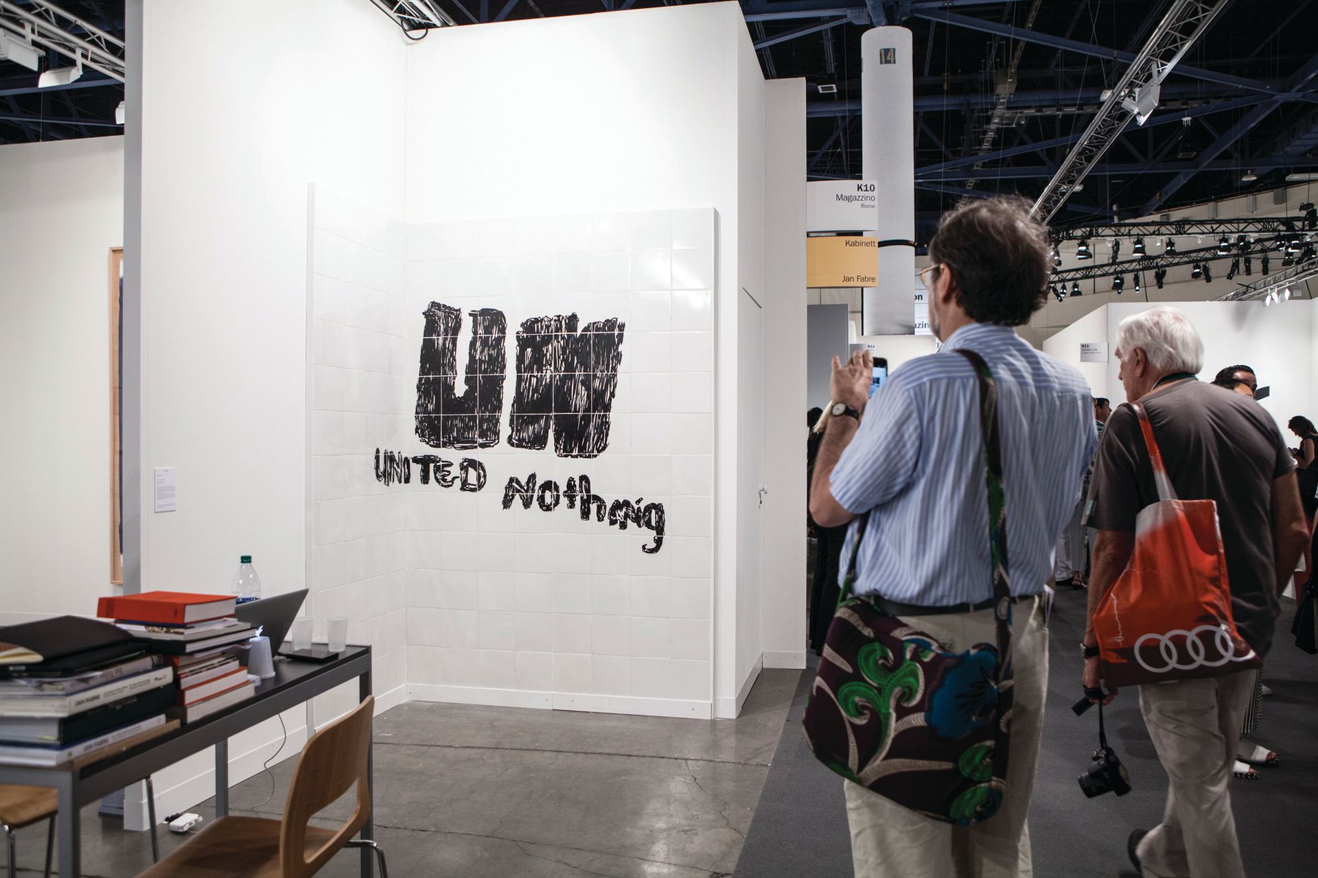 This is, however, still Miami. Much of the serious-minded work is easy on the eye: Neugerriemschneider’s stand (C15) includes trademark works by the Chinese activist artist Ai Weiwei and the ecologically minded Olafur Eliasson. At Magazzino (K10), a work by Vedovamazzei titled United Nothing (2015, edition of three, $17,000 each; one sold yesterday)—an enlargement of graffiti from 1990s Sarajevo—shows the artist duo’s way of “dealing with politics, but in a light way”, says the gallery’s Gabriele Gaspari.