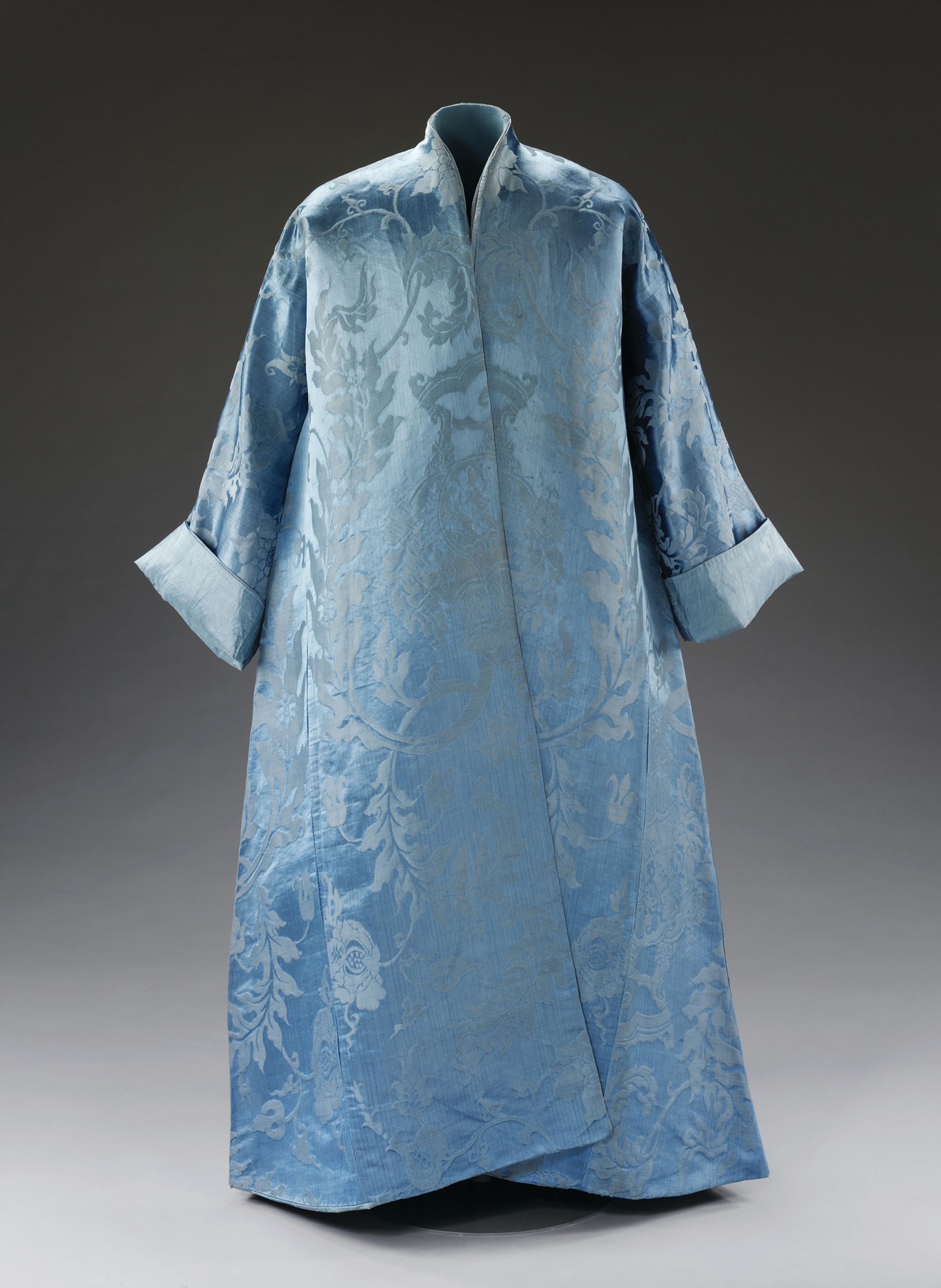 Made of Chinese damask, the gown based on a Japanese kimono was probably tailored in the UK or the Netherlands. The museum bought it at Kerry Taylor Auctions in 2011 for £30,000.