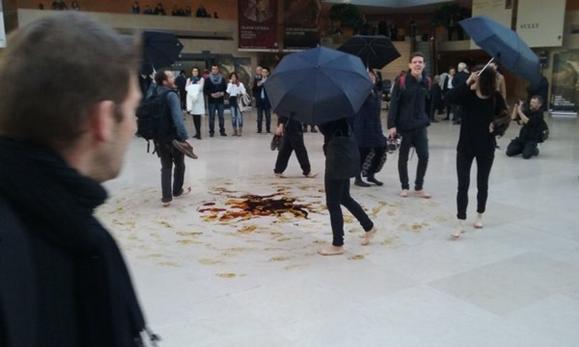 Activists spelt out the words “Fossil Free Culture” in umbrellas outside the museum near IM Pei’s famous glass pyramid, while ten demonstrators were arrested after walking barefoot through fake oil spilled on the floor of the museum atrium. According to the New Internationalist magazine, hundreds of activists chanted: “Total and Eni, out of the Louvre, allez allez allez!”