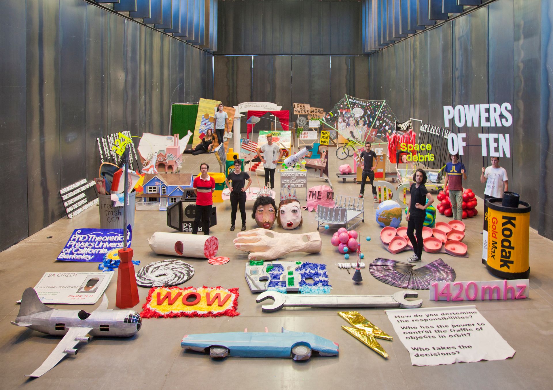 Gang will never be mistaken for anything other than an architect, but Andres Jaque is more difficult to pin down. The founder of the Office for Political Intervention, Jaque resists traditional disciplinary roles: he is an artist, joker-provocateur, and was, at least for the biennial’s first few days, the director of a hit one-act performance. His project, SUPERPOWERS OF TEN (2013), reinterprets Charles and Ray Eames’s IBM-produced short film Powers of Ten (1977) with the production value of a grade-school play—papier-mache heads, outsize props and all. Originally produced for the 2013 Lisbon Architecture Triennial, the performance was retooled for its new setting and included a building maquette of the Union Stock Yards, Chicago’s former meatpacking district. Placards with working-class slogans gestured to the city’s fraught history with labor, but on the whole, the performance stumbled over cutesy disparities of scale and childish techniques.