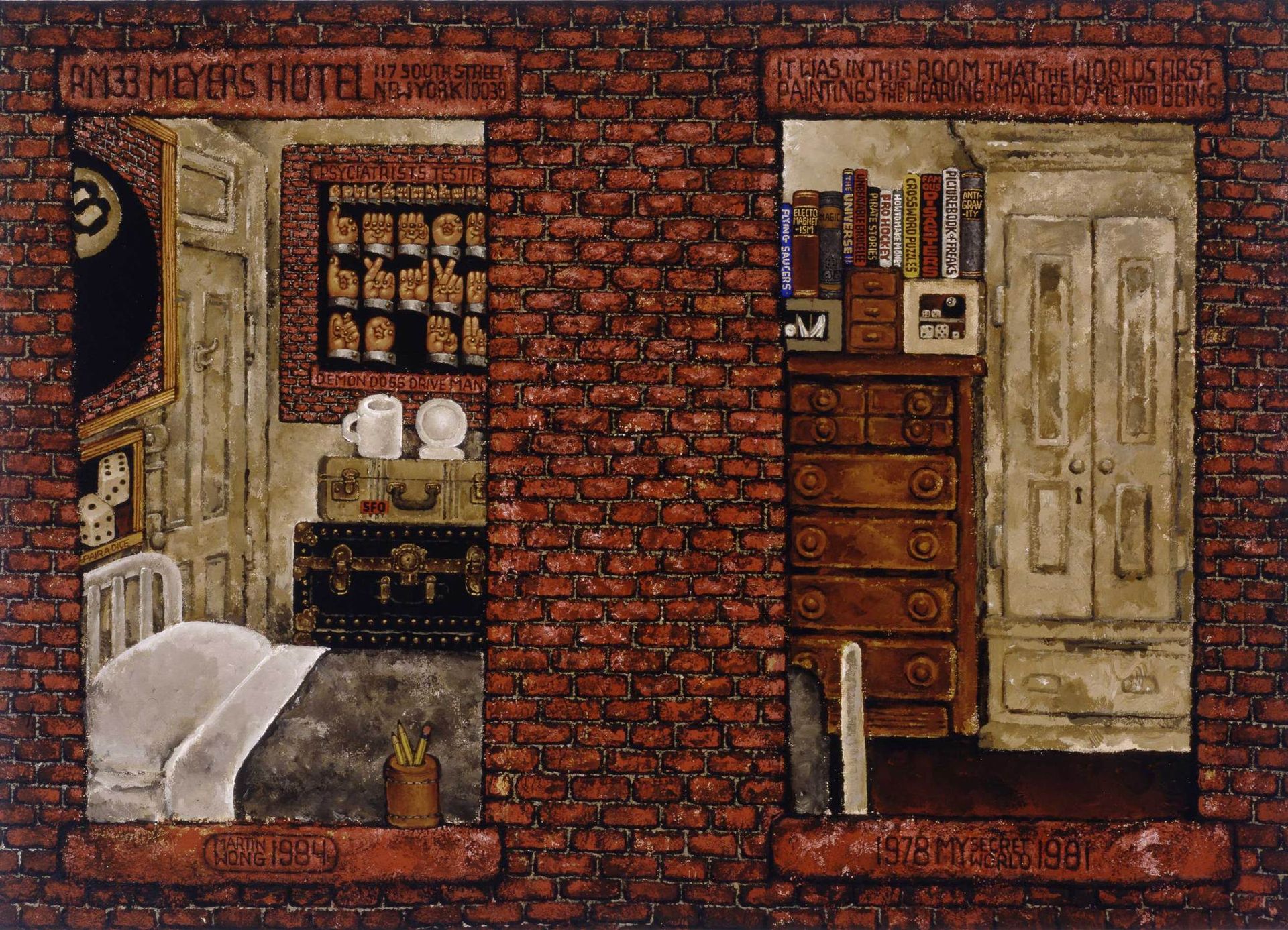 In the show’s first gallery, you see My Secret World (1978) a painting of Wong’s first New York apartment, viewed through a window. You get the sense that Wong was finding his private way, which might explain his comics-inspired paintings of hands that formed letters in sign language.
