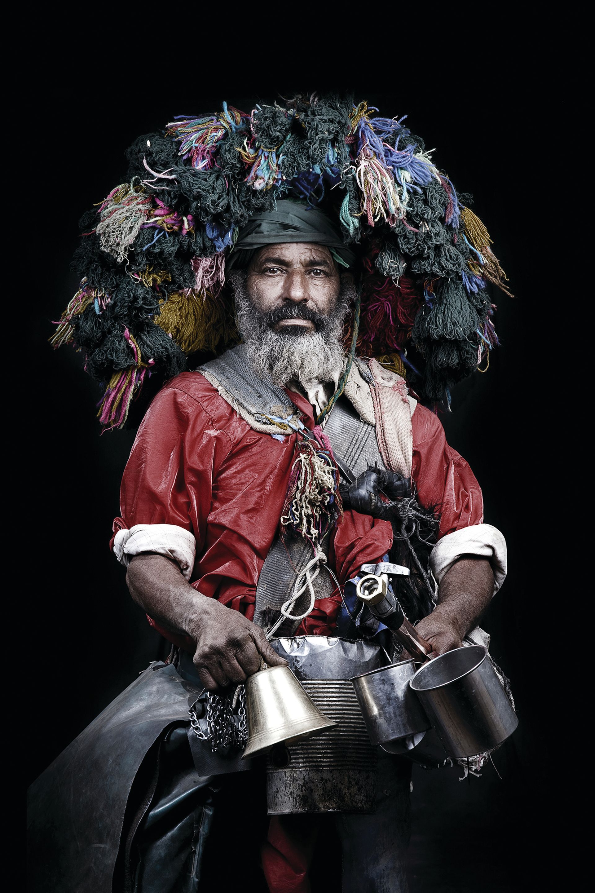 Perhaps inevitably, her most popular series has been the one that portrays interestingly dressed characters from the length and breadth of rural Morocco. She was inspired by Robert Frank’s 1958 The Americans as an idea, but the style, with the full length figures in a neutral, dark space, comes from Richard Avedon. They stand there in their picturesque garb, calm but unsmiling (Alaoui said that this was the spontaneous look of people who were not used to the camera). She would take their pictures quickly, inviting the subjects into her mobile studio straight off the street, usually near markets. Anxious to deflect any accusations of orientalism, she emphasised that these were their ordinary clothes, “I never posed them—I just asked them to stand as they liked. I wanted to record the cultural and ethnic diversity of Morocco away from the tourist traps”.