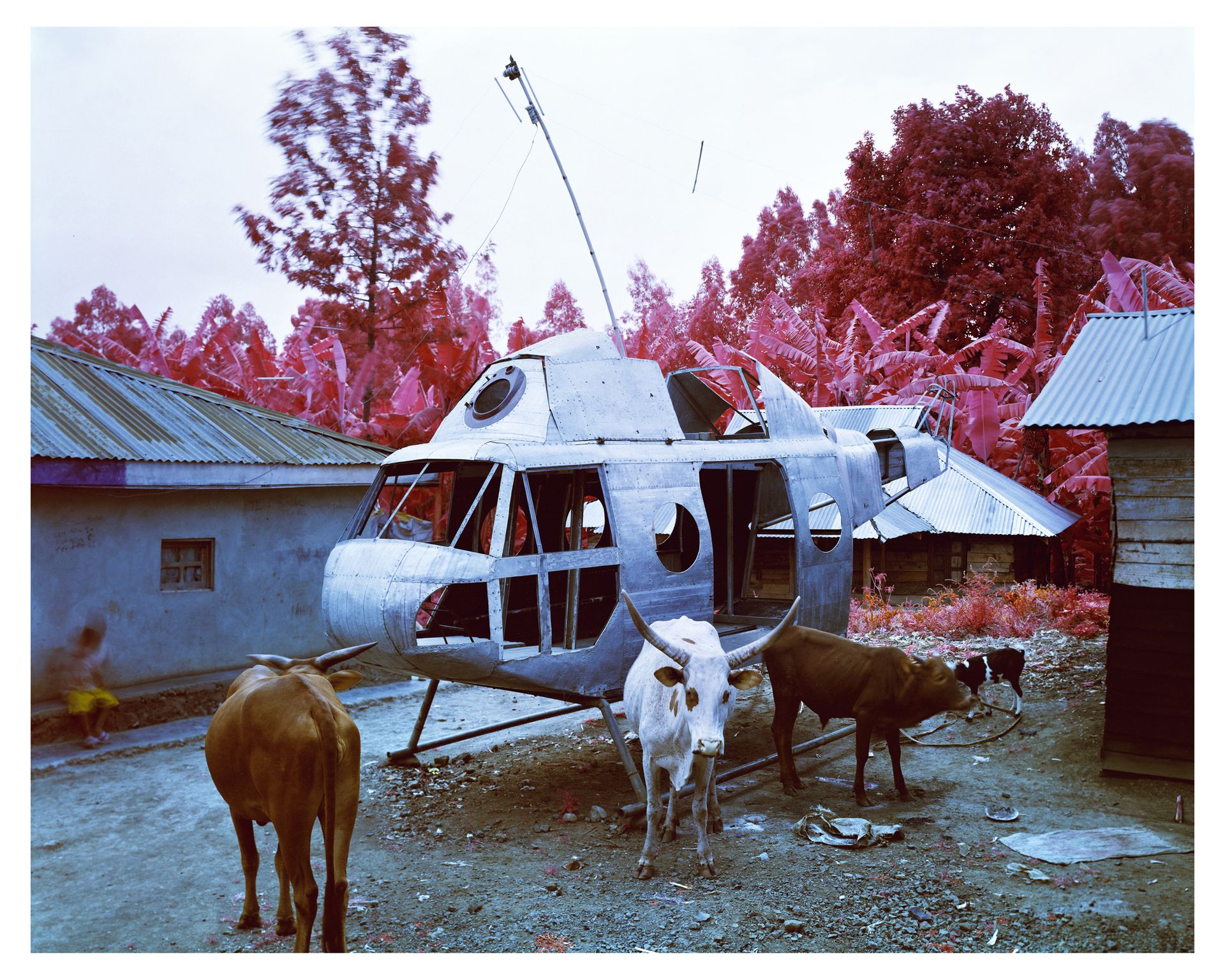 Down the wall are photographs of a deserted Congo landscape by Richard Mosse (Heart of Darkness, 2012), where vegetation is a radiant, reddish purple. In his photographs and films, the colourised landscape of death is mute, as cows circle the shell of a wrecked helicopter.