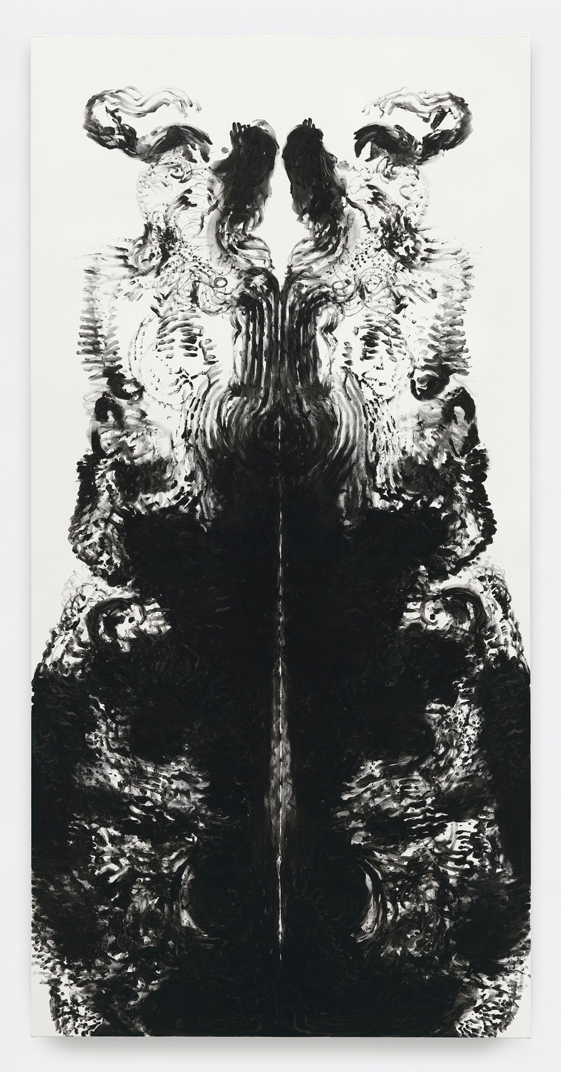 The width is the extent of my arm span and they are double my height. Last summer I made about a dozen that ran the gamut of painterly language and then I started using my fingers to paint, and there was something quite basic about that which I rather liked. But they were still quite wedded to the Is [I paintings] until I made one in which I used both my hands simultaneously and very gesturally and almost blind, because I was right up against the canvas. Then the penny dropped about the bodily proportions and I realised that I could work on that scale and then flip the canvas and be suddenly in dialogue with the other end in a kind of double mirroring. I realised that I could do symmetry quite successfully—maybe all of us can—and I also noticed that something quite curious happens in that, if you give a mark its mirror, almost any gesture gains a kind of authority or purpose. So I made three all in one day and was very excited about what was transpiring, although I didn’t have much purpose or end point in mind. Afterwards I had to go away for a week, but was very excited about getting back to them and they soon developed a life of their own: making them has now become rather addictive.