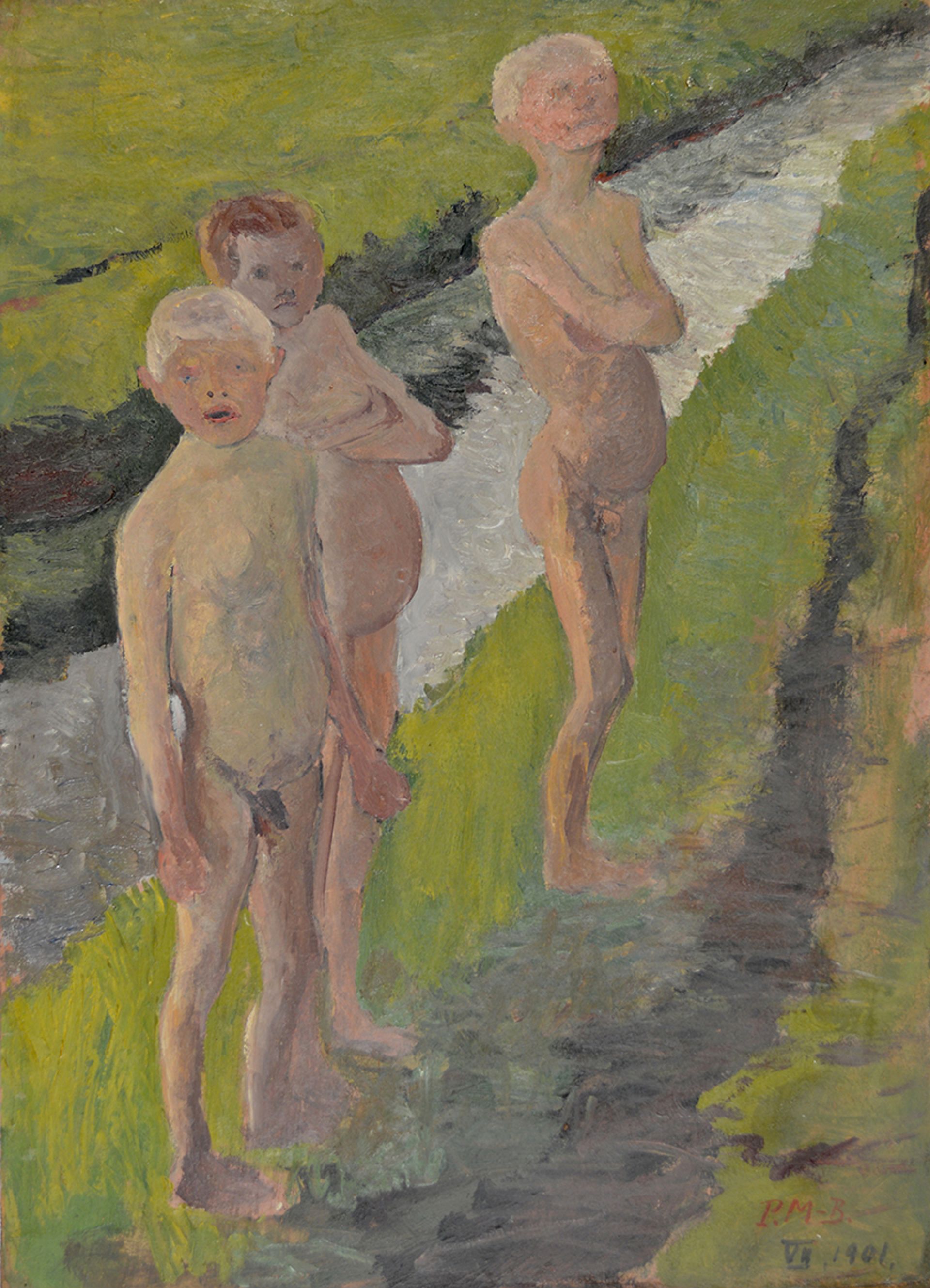 Exotic is not the word that comes to mind in scenes of the windswept bogs of Worpswede. Figures of three nude boys by a canal in a green field (Three Bathing Boys By the Canal, 1901) are spectral and cadaverous, bolts of flesh surrounded by scrub vegetation, anything but the graceful bathers of Cézanne or of Gauguin’s seductive Tahitian girls. Modersohn-Becker has taken cues from those artists, but her eye and her subjects are a world away. There is also a confident looseness in the brushwork of her scene, all the more apparent after one considers a huge drawing on paper nearby that shows several boys depicted with rigorous academic precision.