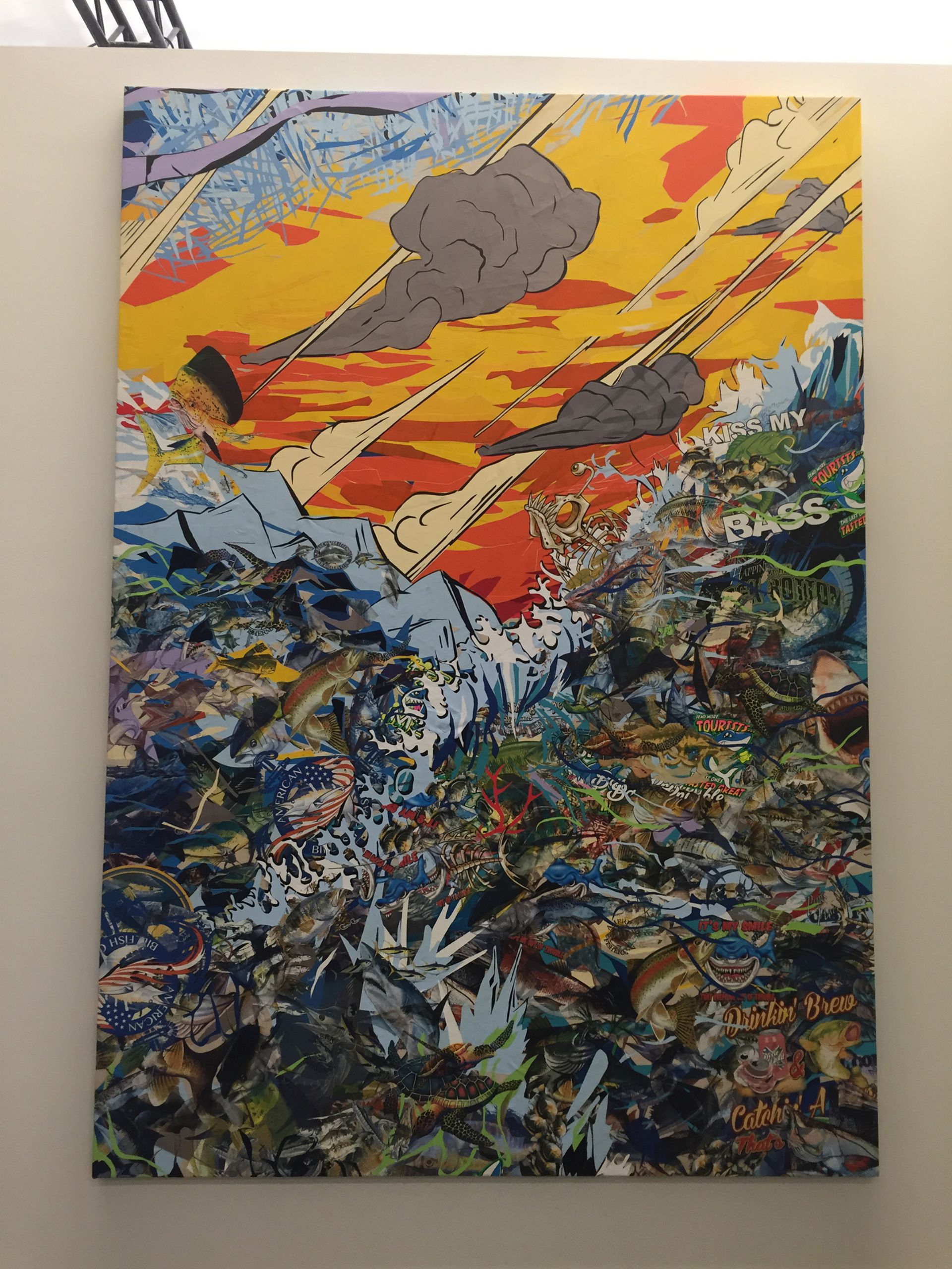 JTT (5th Floor, #12) Anyone who has been to Miami Beach will recognise the materials in Borna Sammak’s splashy collaged canvases, on view with Lower East Side gallery JTT: t-shirt appliques and vinyl panels normally used in sign-making. The Philadelphia-born, Brooklyn-based artist has his own heat-press in the studio to create the built-up layers of cut-outs. He sources the vinyl pieces online from suppliers that usually cater to tourist tat shops and so Sammak fittingly calls the series “beach crap”. The works, priced between $25,000-$30,000, come out of a project at the Nada fair in Miami a few years ago, and keen-eyed viewers might catch a glimpse of the Alvin’s Island logo from the Lincoln Road store in a mesmerising 30-second looped video. — Helen Stoilas
