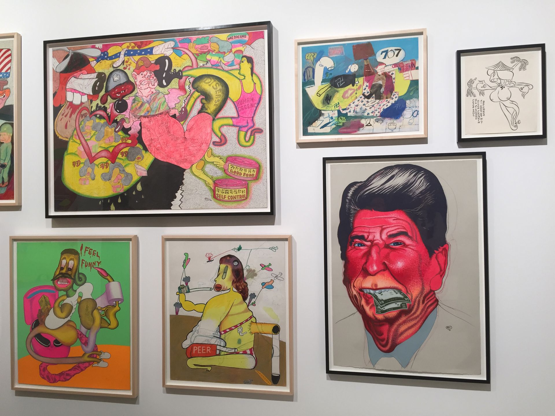 Venus (5th Floor, #17) There is no question that the 1960s are having a moment, from fashion to music to a revival of studies on the psychiatric uses of hallucinogens. But that is not what makes Venus’ booth at Independent so trenchant. The works by Peter Saul, from the estate of the Chicago dealer Allan Frumkin, feature the Day-Glo sick-making colours of the era but combine chaos and dysmorphia with the same compositional control that makes Philip Guston so enduring. The humour tackles big ideas in fake-dumb ways, like Human Concern Personal Torment (1969), where a person labelled with the first half of the title wraps his arm around a cross and bleeds the words that comprise the second. It looks too good not to take it seriously. The biggest work is an untitled painting from 1973 that offers a disgusting vision of the nice house, nice car, beautiful people fantasy. All of this could be seen as a bit ironic considering the gallery is owned by the billionaire Adam Lindemann, but you can’t fault him for nailing the current social climate. Ronald Reagan with Money in Mouth (1984) delivers on what it promises, but the Gipper’s skin is in virulent hues of magenta and orange. If the decision to include it wasn’t inspired by Donald Trump, I'll eat my hat. — Dan Duray