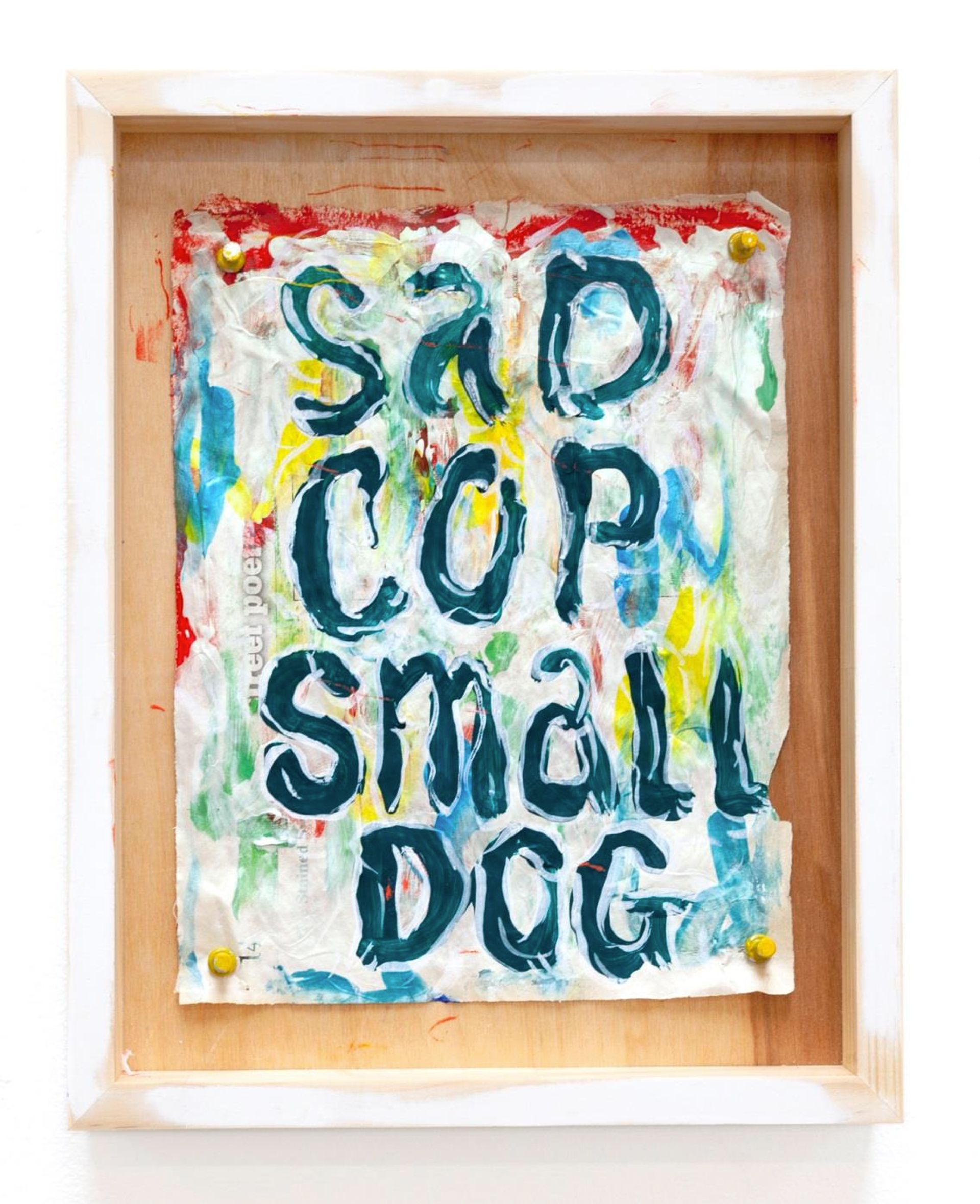 Mitchell Innes and Nash (6th Floor, #10) Mitchell Innes and Nash offers an array of works by the multidisciplinary artist Pope.L. The stand’s centrepiece is a sculpture, Coffin (Flag Box) (2008), an L-for-Liberty-shaped rough wooden box that generates the uncomfortable sound of a flag flapping. These are accompanied by a number of newer wall works, the most interesting of which are shoe-box-sized—and just as textural as they are textual—often with gesso or acrylic smeared over the words. The words on the other hand are equal part signifiers and signifying. Sad Cop Small Dog (2015) evokes just what it needs to, and feels pretty groovy with is colourful bubbly script—but, wait, why is it pinned to wood with push-pins? And is that blood up on top? Tight works, to be sure. — Dan Duray