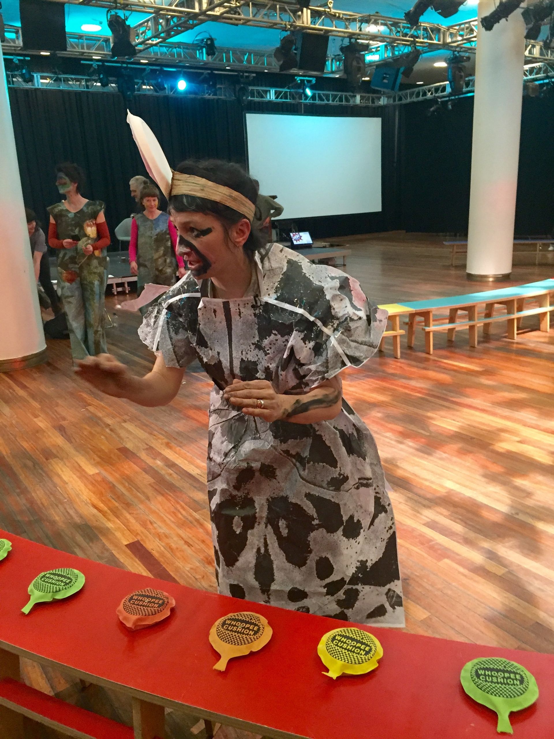 Then last night there was more girl power at the Southbank Centre’s Royal Festival Hall where a more recent, 2012, Turner Prize nominee, Marvin Gaye Chetwynd, was mounting the premiere of her performative extravaganza, Here She Comes. Commissioned to celebrate the 70th birthday of the Arts Council Collection, and part of the Wow: Women of the World festival, the work tells the stories of great women from different moments in history from Boudicca to Montessori in characteristically carnival-like style. This memorable Gesamtkunstwerk transported all present to a riotous parallel universe featuring seminal feminist texts, vagina headdresses, a token naked male and the establishment of a new Guinness world record in setting off whoopee cushions—73 in 30 seconds—achieved by a woman, of course…
