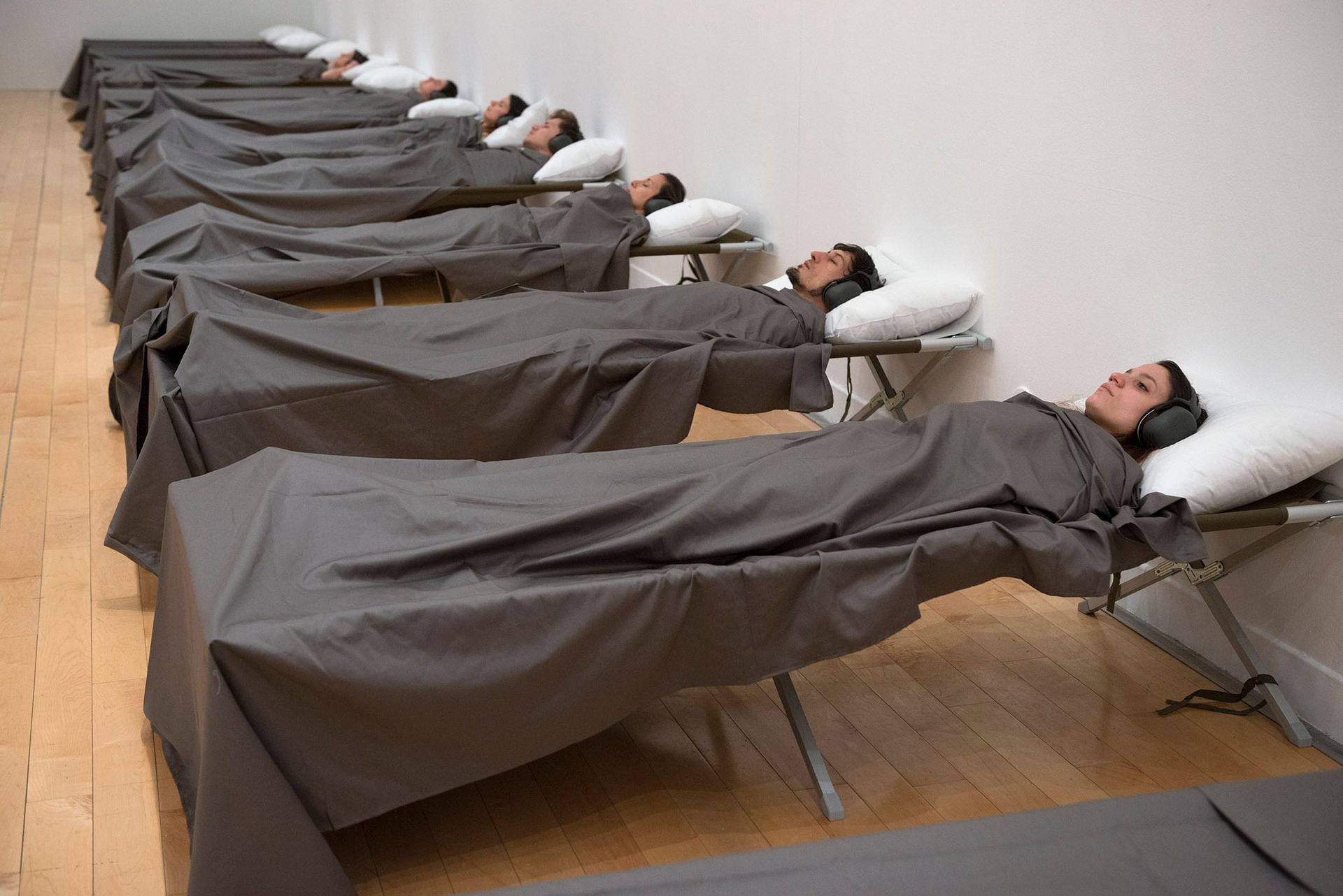 The Method is less an interactive work of art than a primer for appreciating performance. Participants must first deposit their personal belongings, including phones and watches, in lockers. They pass through three rooms of warm-up exercises (breathing, stretching) before putting on noise-cancelling headphones and taking the hand of a facilitator. In silence, people walk in slow motion, lie on barracks-style beds and stand with their eyes closed on low plinths. They sit studying coloured squares, sorting and counting piles of rice and lentils and, in pairs, sustaining the “mutual gaze” that moved some to tears during The Artist Is Present.