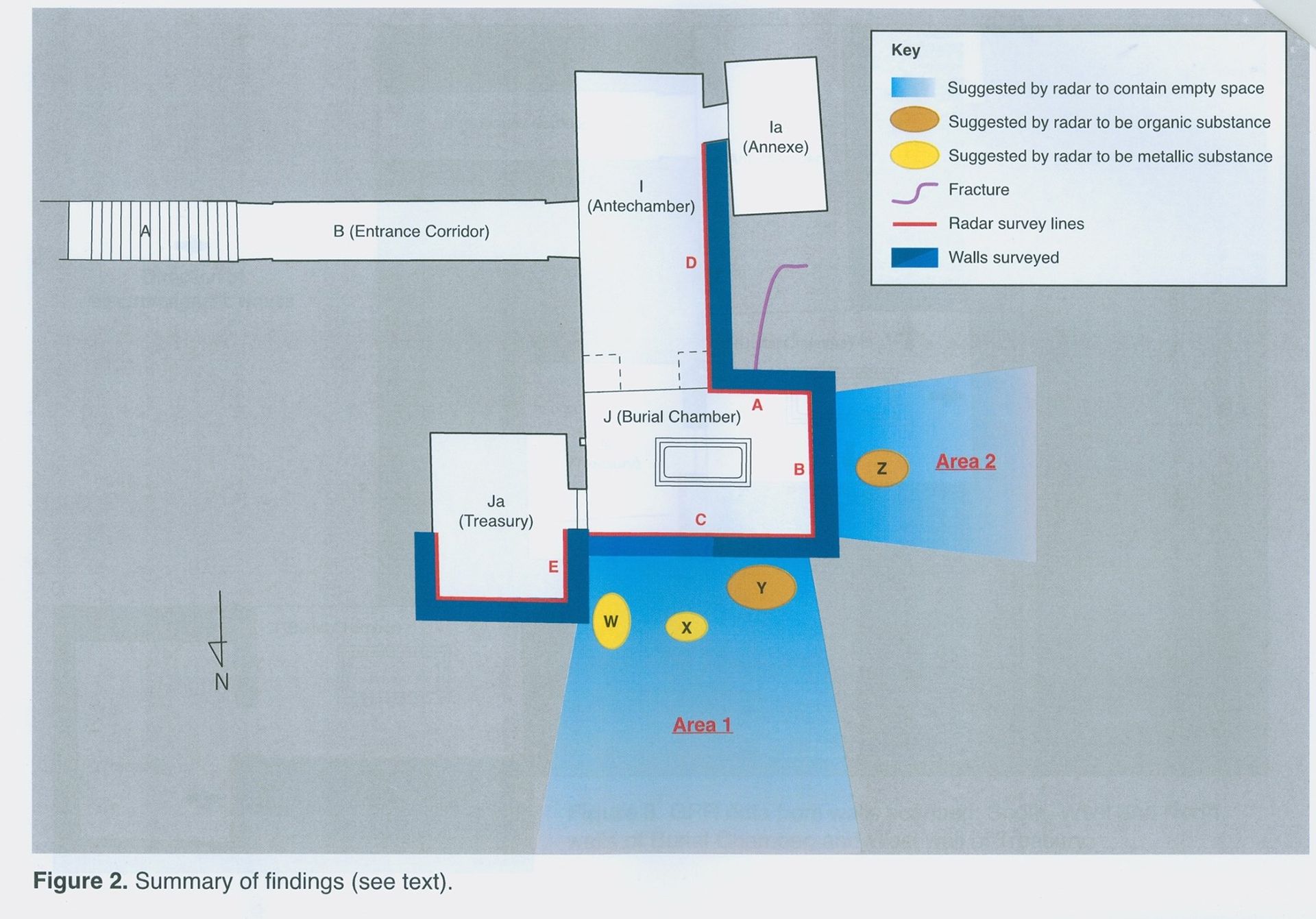 Some anomalies in the images were interpreted by Reeves as the “ghosts” of doorways, sealed and plastered over before Tutankhamun’s burial. A subsequent physical examination of the tomb walls, undertaken by the Ministry of Antiquities and Reeves, added weight to his suggestions. Hidden for more than 3,000 years, these rooms—identified behind the burial chamber’s northern and western walls—were revealed using a modified ground penetrating radar scanner in November 2015. Further radar scans are scheduled to take place in late March, with the results of these investigations to be announced in April.