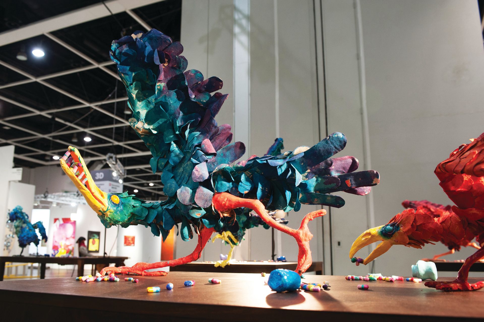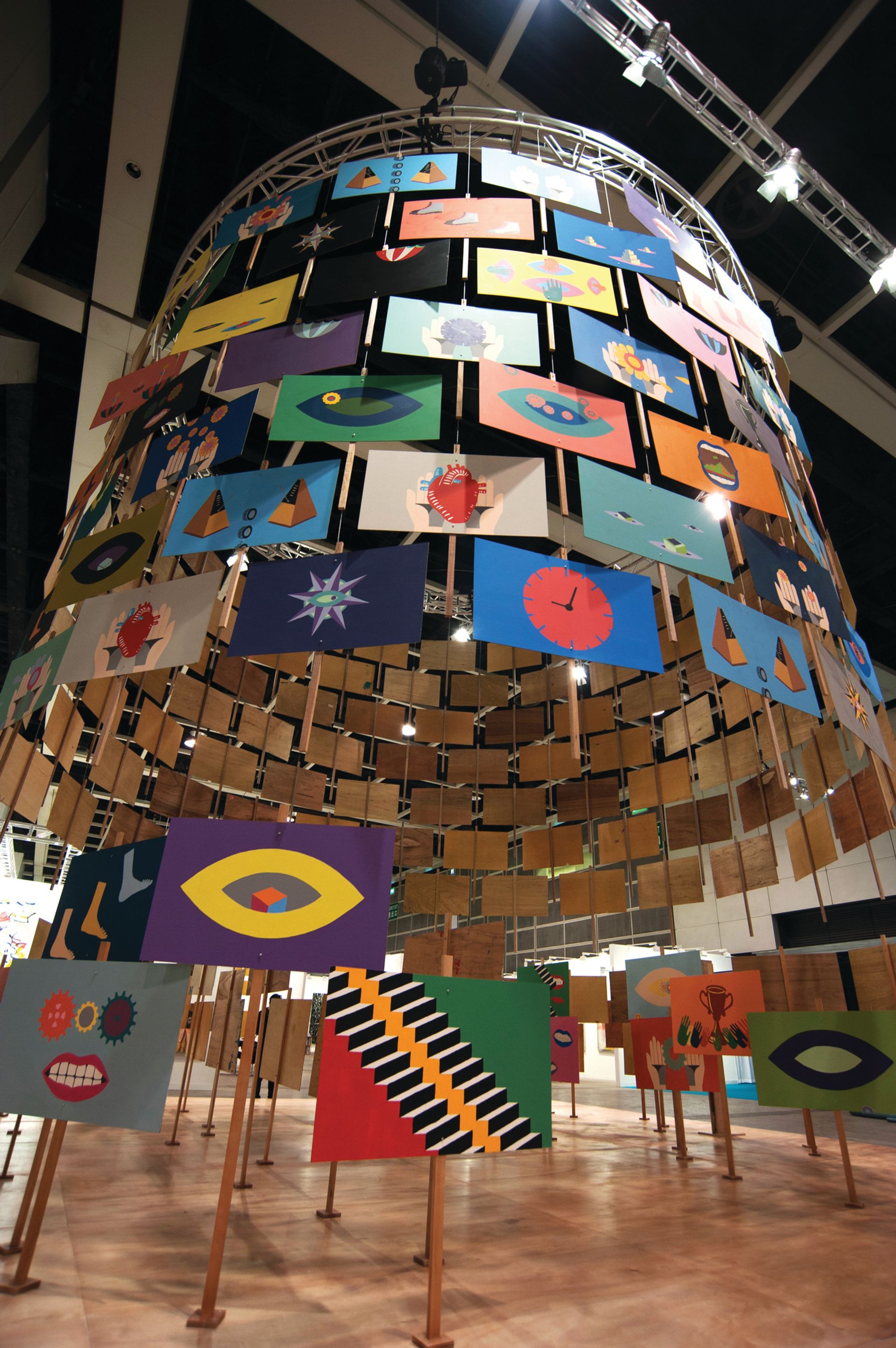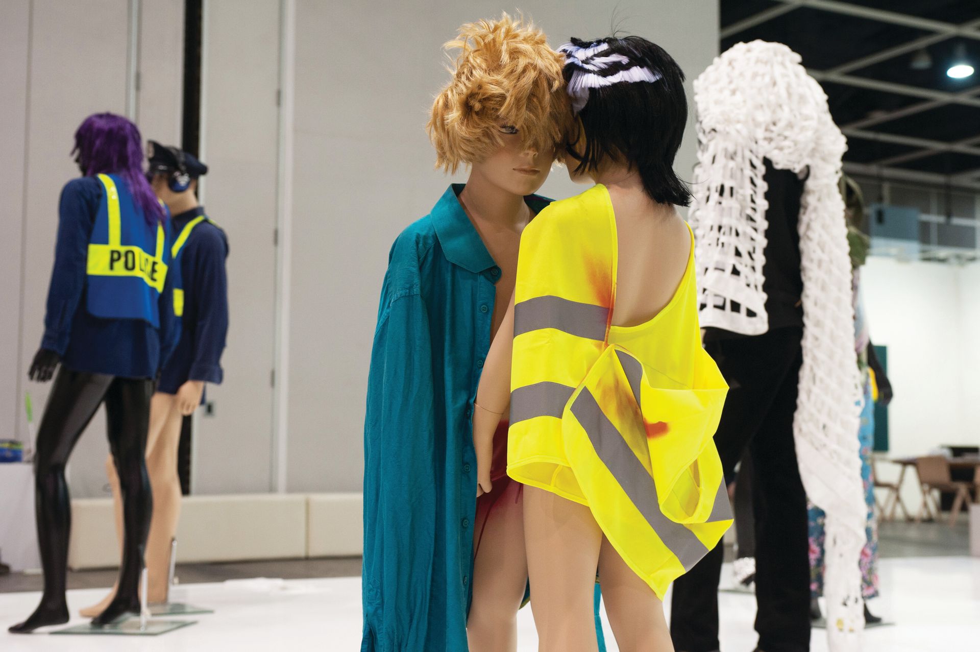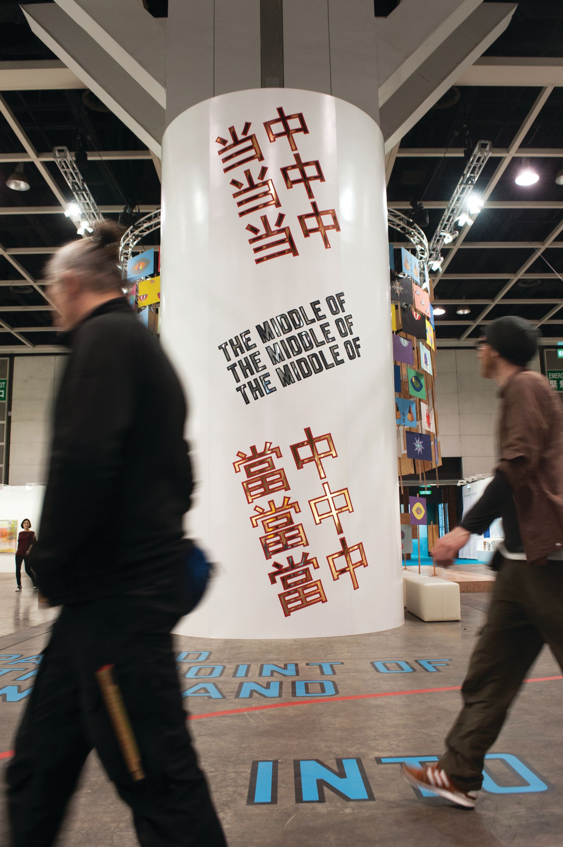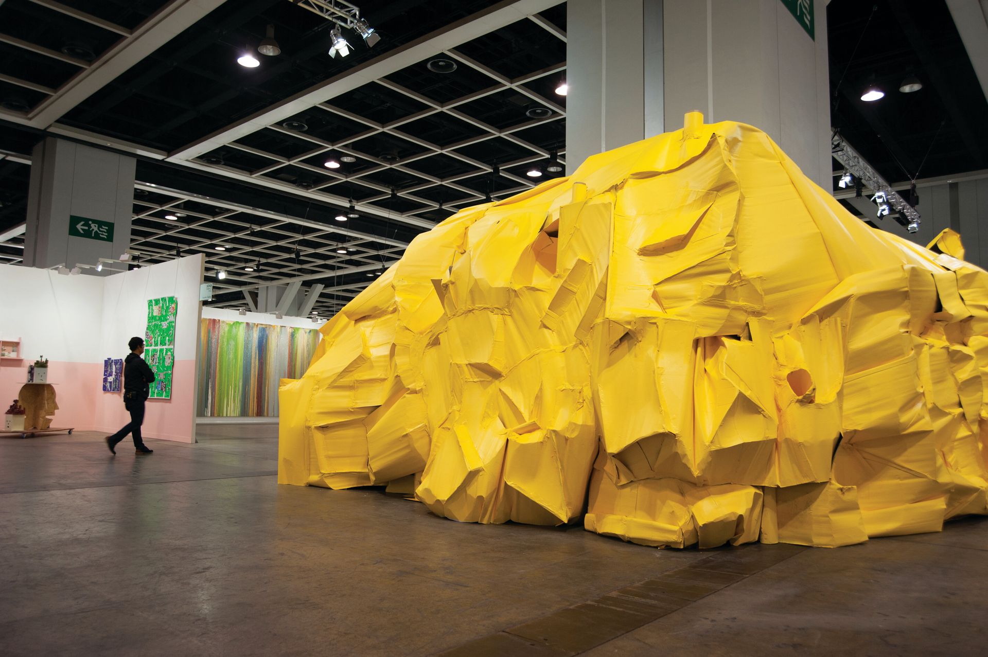 From an amphitheatre of protest placards by the young Indonesian collective Tromarama to Richard Maloy’s hulking mass of yellow cardboard around a column, the works “have more room to be articulated” in the cavernous spaces of the Hong Kong Convention and Exhibition Centre, Glass-Kantor says.