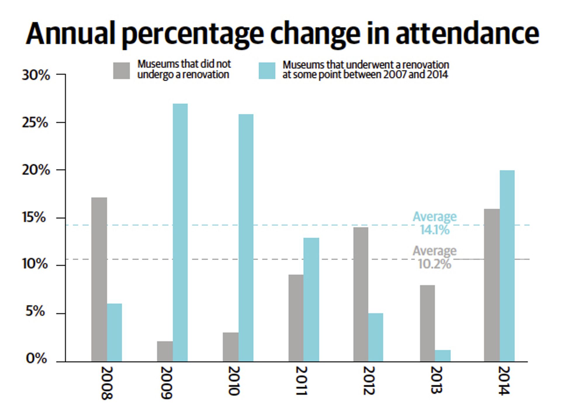 Methodology Of the nearly 500 museums that submitted attendance figures to our annual survey, 50 had undergone an expansion between 2007 and 2014. We had enough historic attendance data on 16 museums to be able to analyse their audiences pre- and post-renovation. We analysed the figures only for those museums that supplied at least two years’ worth of attendance figures pre-expansion and at least one year post-expansion.