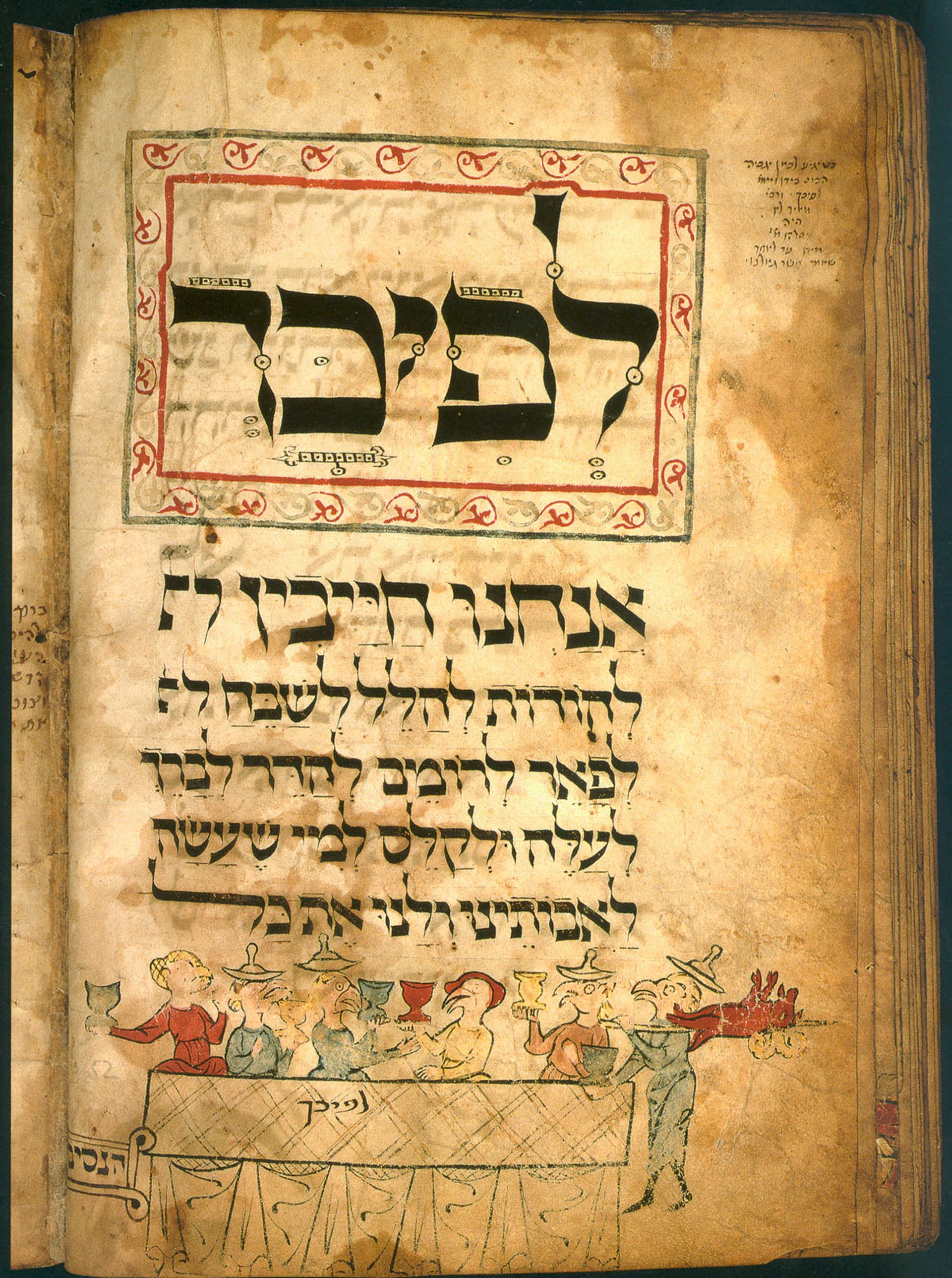 The manuscript, dated to 1300, is a work in pen, ink and tempera on parchment by a scribe named Menahem from southern Germany. It is described by the museum as the earliest Ashkenazi Jewish illuminated Haggadah. Parts of the book were reproduced in full colour in the popular edition The Medieval Haggadah: Art, Narrative, and Religious Imagination, published by Yale University Press in 2011. In a postcard sold in the museum gift shop, two pages from the manuscript show bird-headed figures preparing matzoh for Passover.