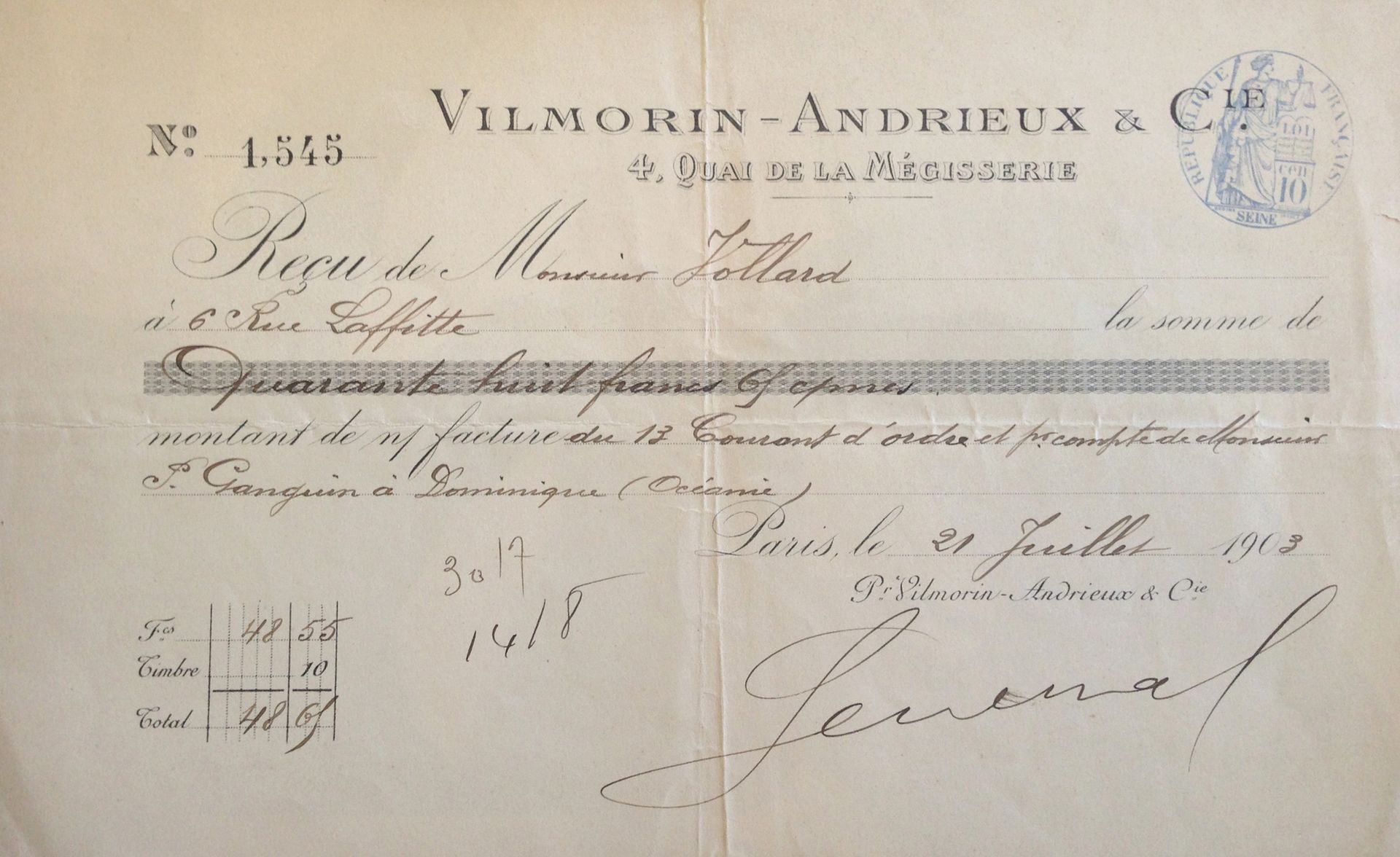 The order finally reached Vilmorin, but without payment. On 1 July 1903, Vilmorin asked Vollard “to pay for the articles ordered by Mr Paul Gauguin, so that, if you reply in the affirmative, we may ship them without further delay”. A Vilmorin receipt records that Vollard eventually paid 48.65 francs on 13 July for “Monsieur P. Gauguin à Dominique (Océanie)” (Dominique was then the French name for Hiva Oa). News of Gauguin’s death only reached Paris in August.
