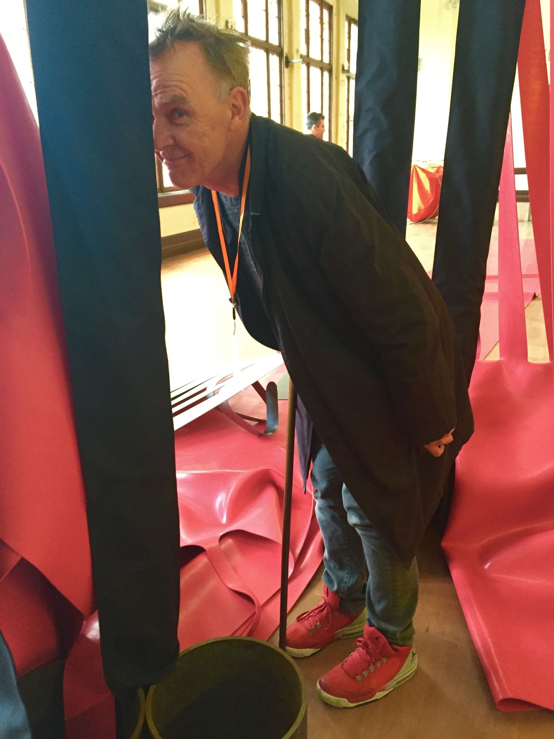 Another spectacular venue reflecting Glasgow’s former glory is the now-dilapidated Kelvin Hall, which once housed exhibitions devoted to the energy industries and whose upstairs chamber is now occupied by an evocative sculptural installation by Claire Barclay comprised of rubber, steel, coal tar, cotton and engine grease. Among those experiencing this evocative and pungent work at yesterday’s (7 April) press preview was the Guardian’s partially incapacitated, chief art critic Adrian Searle, who was gamely hobbling around the festival’s multiple venues with the aid of a walking stick. Apparently the intrepid journo’s foot injury was sustained by falling off a platform (shoe) whilst taking part in a recent Juergen Teller shoot, which also involved a donkey and a couple of porn stars. And who says critics don’t suffer for their art?