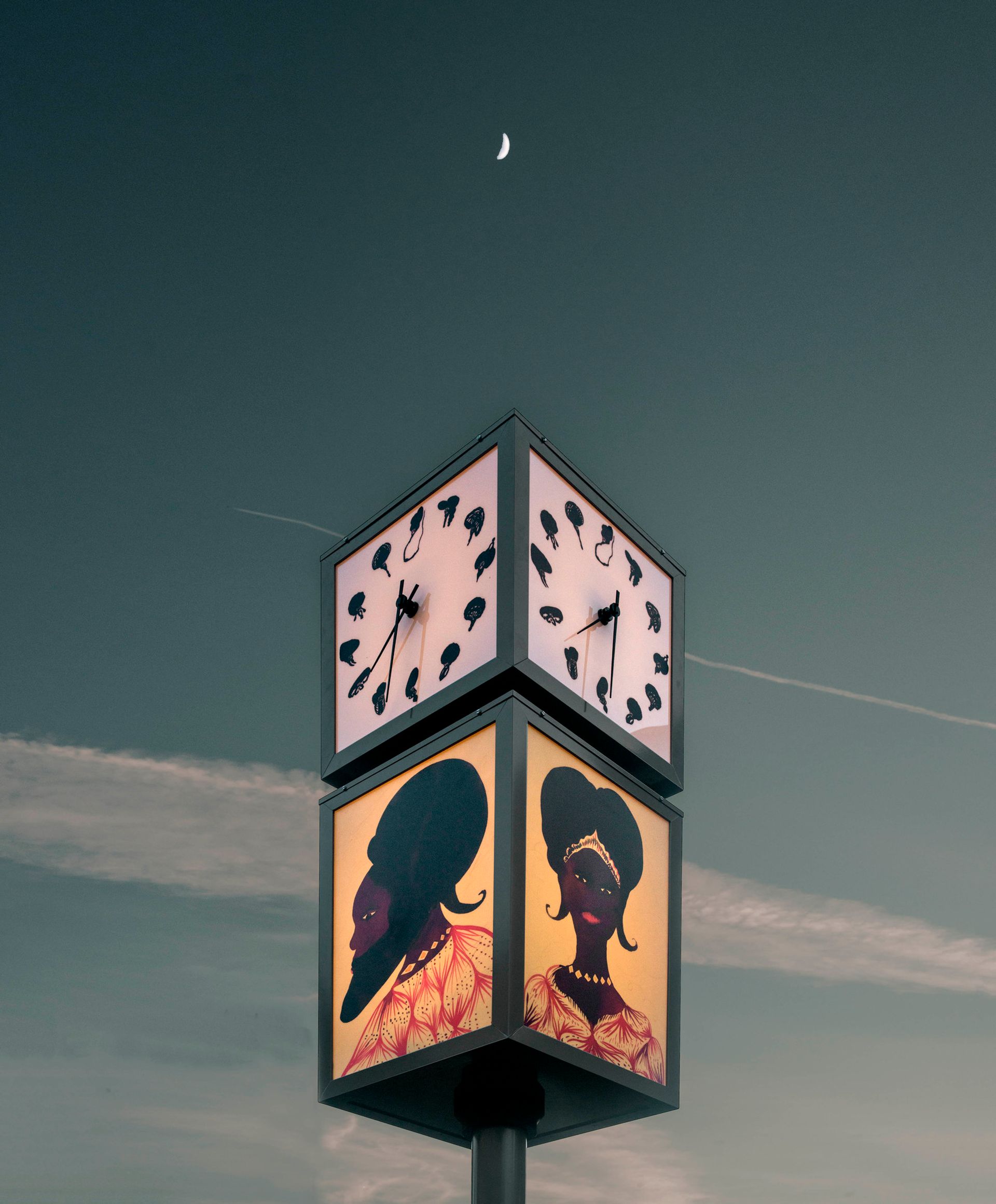Just before the sun went down, the lights came up on Chris Ofili’s Black Hands, the inaugural commission for a new four-metre high illuminated pedestal clock whose four-sided face now bears 12 of his signature Afrohead pencil drawings, while the light box below shines out four of his Afromuse portrait heads. (Invited artists will transform this clock annually.)