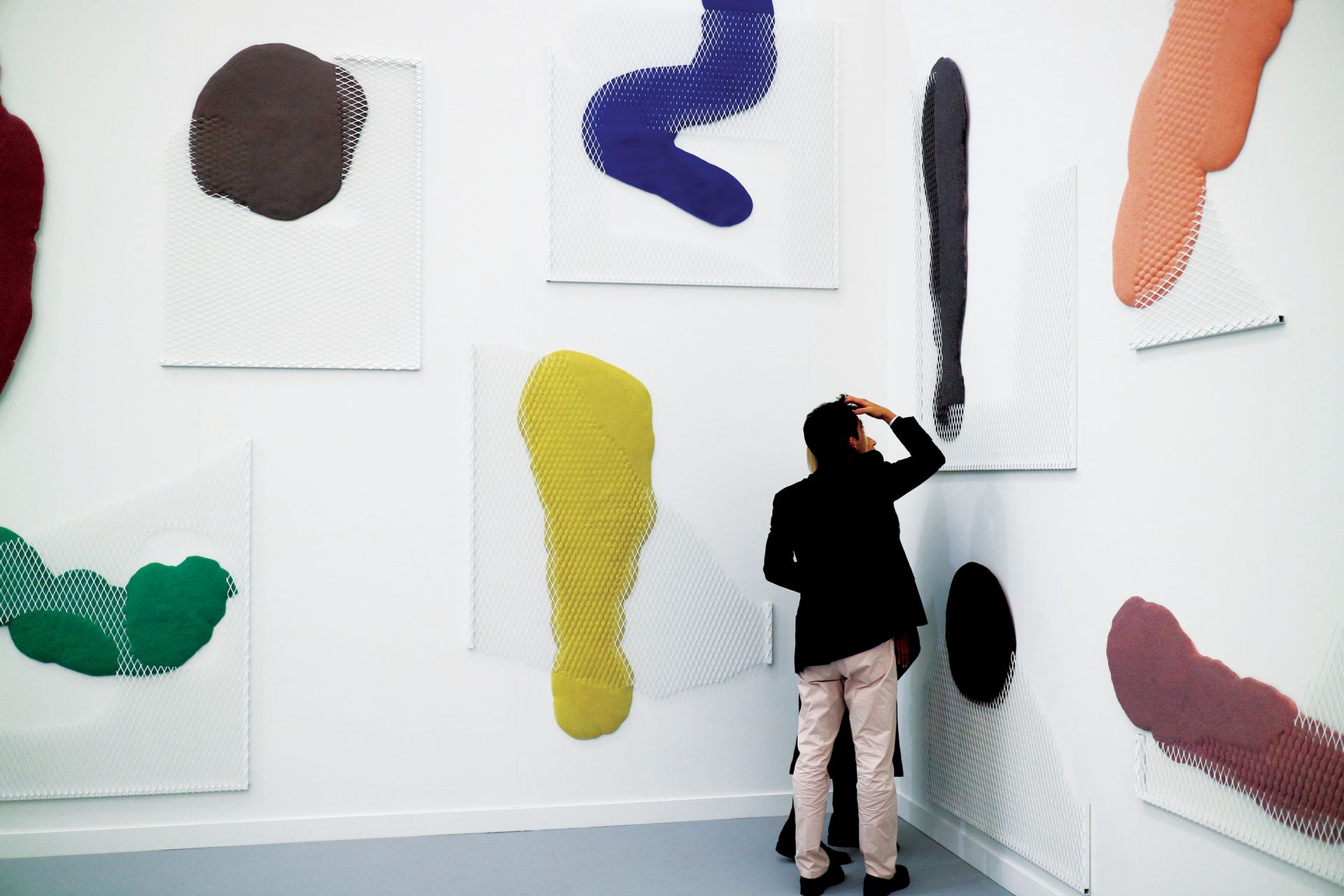 The German-born, Los Angeles-based artist Phillip Zach’s wall-based sculpture combines hard- and soft-edged elements. “I’m interested in the specific use of materials we are familiar with,” Schöneich says. Here, Zach combines fencing steel with “an unknown form that is fragile and pushes through the mesh”, the curator says, referring to the free-form shapes of coloured, expanded foam in this new work, Untitled Properties (2016).
