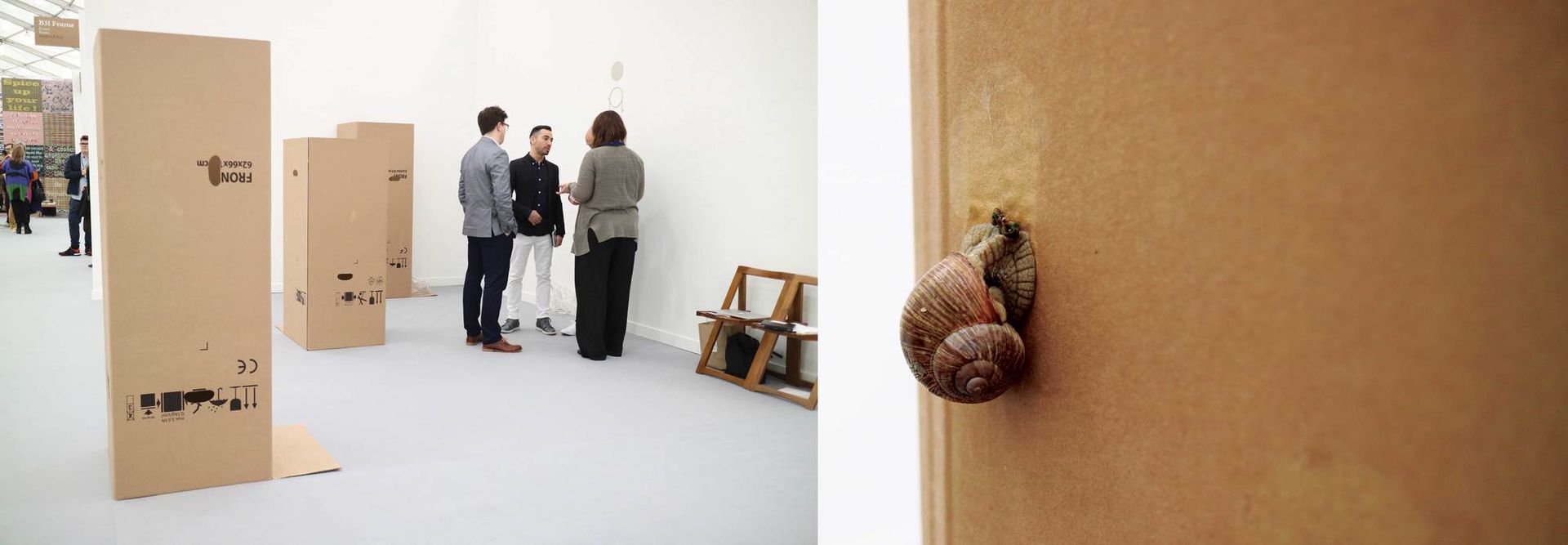 The Chicago-based gallery has installed works by Nick Bastis that together form a home from home for a team of snails. The Helix pomatia snails, which can be found on cardboard boxes used to transport refrigerators, are hibernating unless they are disturbed on their temporary tower blocks. The artist has previously employed the obliging creatures in other sculptural pieces. Works with snails on the gallery’s stand include When You Don’t Find What You’re Looking for, Sleep (2014-16).